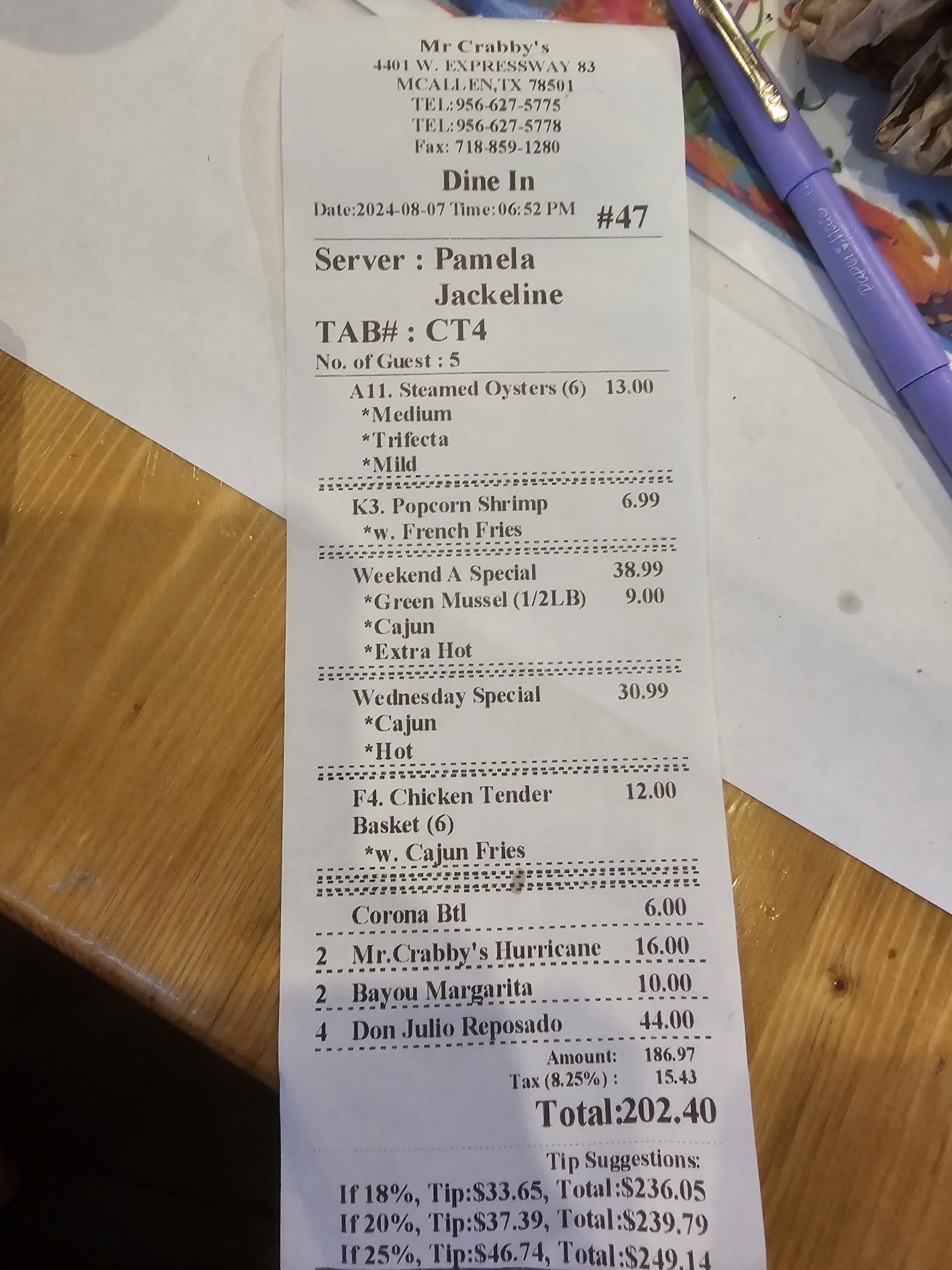 Read more4-11-25 We really wanted this place to be good! Fortunately, the food is good, but that is where the positives of this restaurant end. The decor is ok, but cant seem to decide if it is down town NOLA, or the middle of the sea. The walls are mostly wood covered, with the bottom half burned, while the upper half still raw, however the molding at the top is also burned. Do it all or none, but once you make the transition, stick with it. Fix the tinting on your windows. With it peeling the way it is, it looks terrible. Now for our experience. We were taken to a table that had not been turned from the night before. There was still a stain from a glass on the paper that covered the table, and a dirty plate in the pail. When pointed out, the waitress offered to remove things, but our food was already on the table. We could have moved to another table, but that was not offered. The afore mentioned pail also contains the "cutlery" which are packets of a plastic fork spoon and napkin, and a "bib". I ordered shrimp etouffee while my wife ordered the catfish basket. The etouffee was good, except for a couple of shrimp still had some tail left on them, and a few bits of bay leaf was so hard I thought I had plastic in my mouth. The catfish had little flavor and the fries in the basket looked as if they were frozen. To top it all off, the waitress walked passed us, dropping the bill off without a word. When we looked at it, it wasnt ours. It was for a party of 4, and triple what ours should have been. We asked for a manager and spoke with him about all the things I have written. He got the waitress to bring the correct bill, with an included discount of not quite half my plate. This will be our only visit to Mr Crabbys. I wish everyone else luck if you chose to try it...