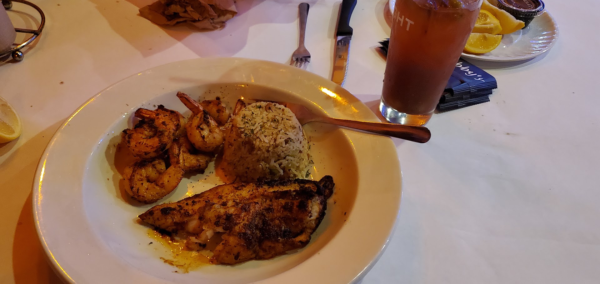 The food was ok. We got the fried gator for an appetizer and then I got the blackened catfish and shrimp. It was alright, but for a 27 dollar plate of food I would have expected more food, was like 7 shrimp and two catfish filets with a serving of rice (picture attached). My wife got a 14 dollar shrimp basket and she got more food than I did. Drinks were good though, my bloody mary was mixed well and had a nice kick.