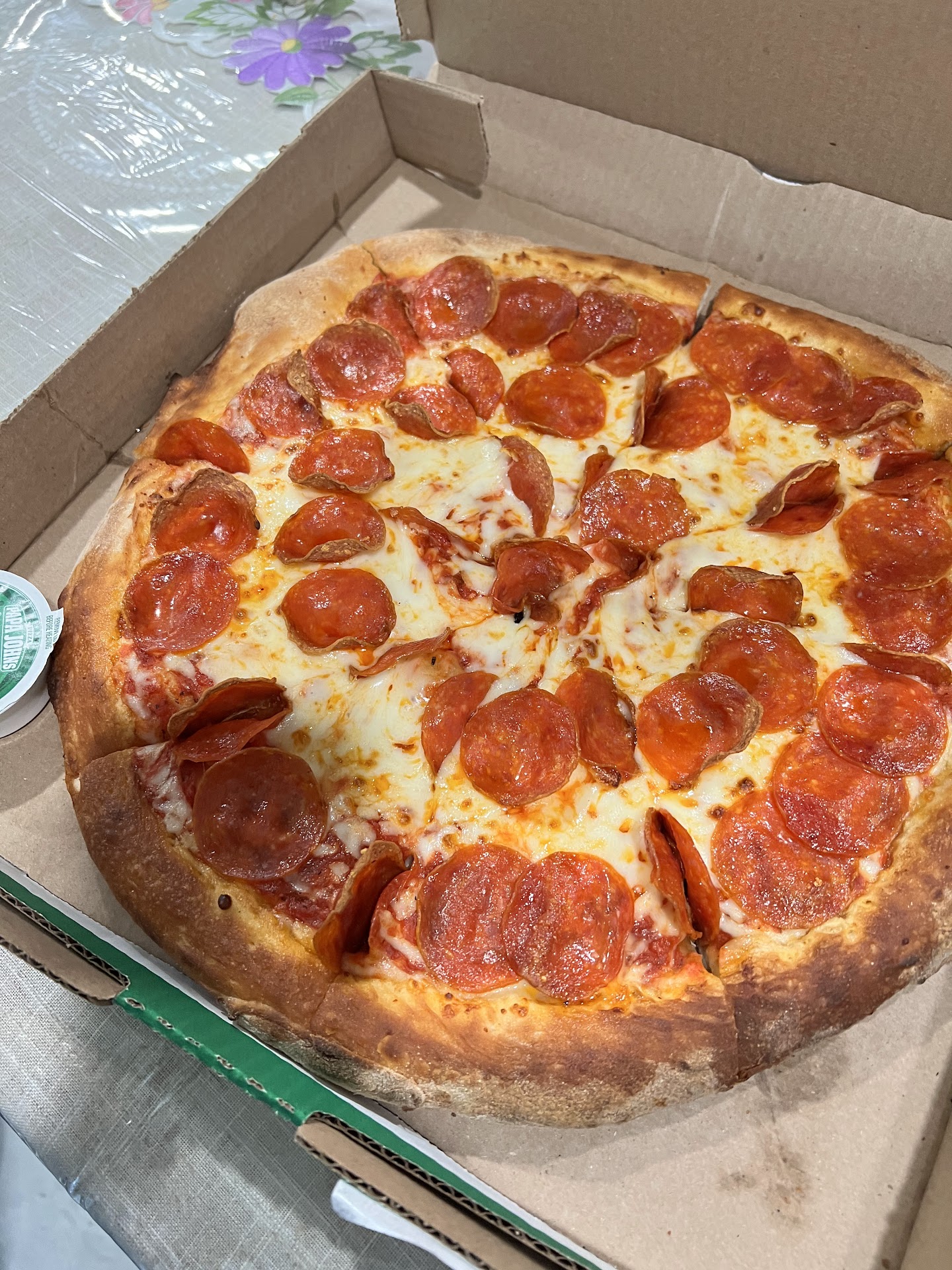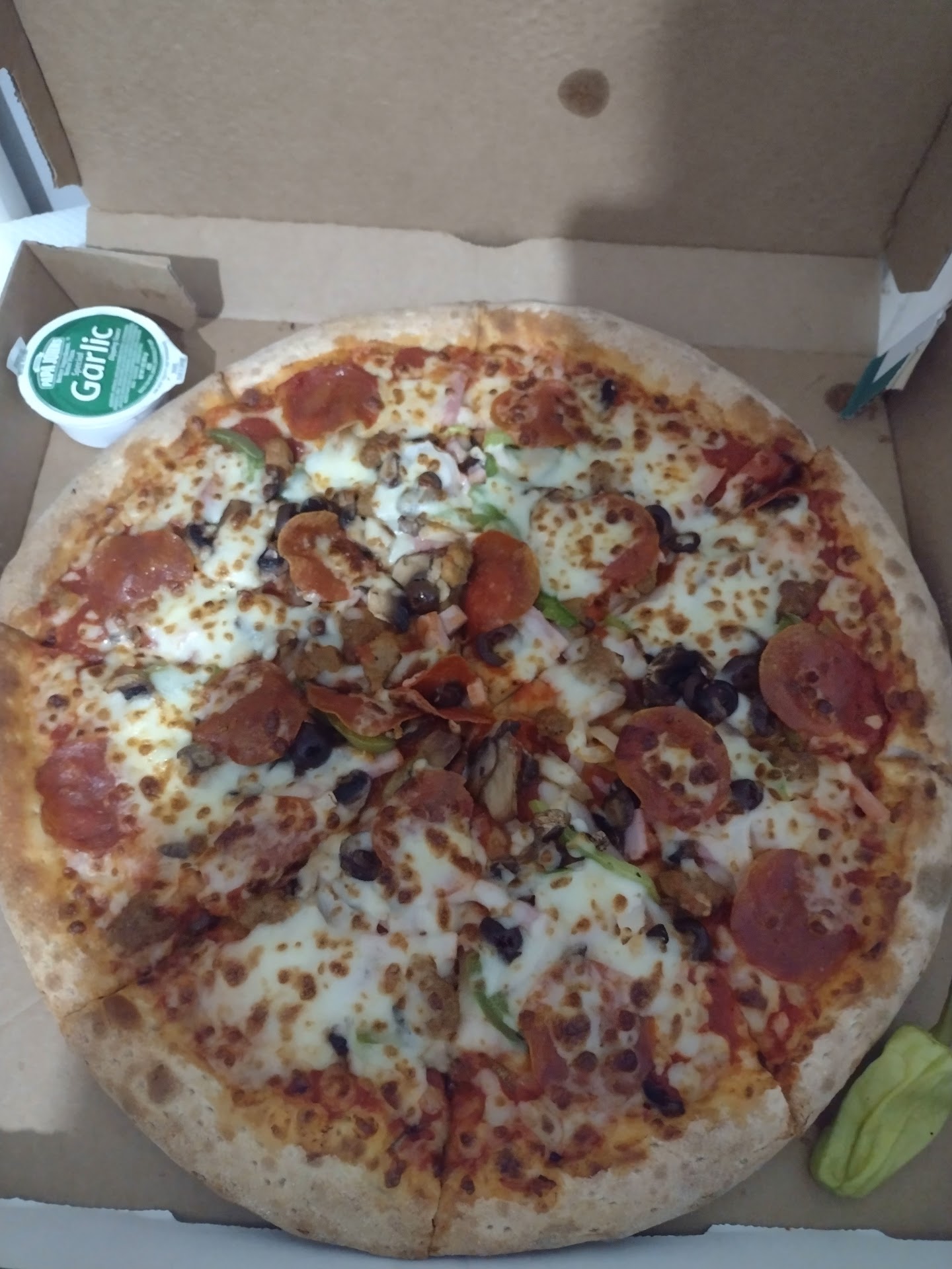 Read moreI have not eaten Papa Johns in years, but my piano lesson ran late and I just wanted to pick something up on the way home, so I looked over to my passenger seat and I saw a stack of mail with papa Johnâs coupons. I called it in and drove by and picked up a carry out pizza. I paid 6.99+ tax. When I got home I opened the box and was pleasantly surprised. Pizza was on point and even came with a pepperoncini and a garlic dip! Oh, and they give you cheese and pepper packs too. Most pizza places no longer include those. I loved the...