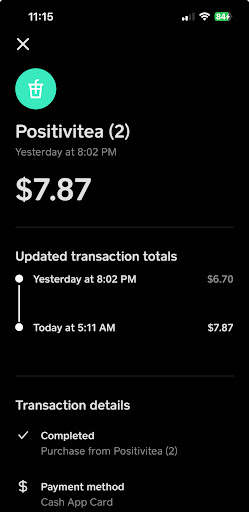 I went to Positivitea on January 6th 2025. I bought a small blended taro with brown sugar tapioca. The total was 6.70 when I payed via cash app at the shop. Positivitea up charged me the next day at 5 AM. The two people at the front (who Iām assuming are the owners) seemed annoyed to be there, maybe they were mad at each other- I donāt know. I felt awkward and a bit uncomfortable, I just wanted to order and leave, so thatās what I did. I was not rude (I worked in customer service before so I understand) I smiled and thanked them after ordering, but I did not leave a tip. I bring that up because the only way I think something like this would happen is if I left a tip- I donāt leave tips if I have to go up to order and get my items. I didnāt have much money in that card, after that initial transaction I only had $1.48, so after the up charge I now have 31Ā¢. This is actually insane that Positivitea took it upon themselves to take more money from me than agreed upon. Especially an up charge of $1.17 on a $6.70 item (including tax). I will not be coming back to an establishment that STEALS from its customers. Neither will my friends or...