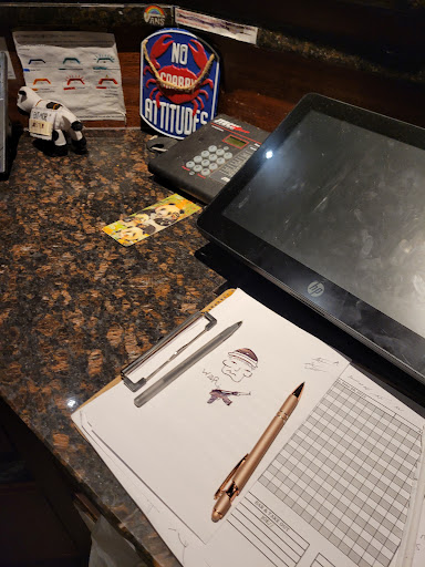 Issues were, As we walked in at about 8:30 pm Wednesday evening no one was at counter and took about 5 minutes. It was not a long time but on the counter a was a disturbing drawing that was very visible to any and all customers coming in.