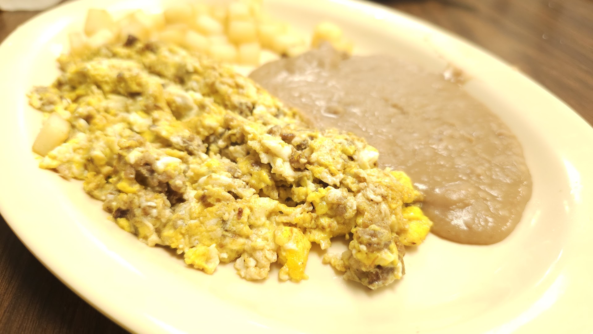 The eggs were cooked perfectly over medium, the salsa for the eggs was tasty, the potatoes were crispy made fresh to order, the beans were a bit simple pork lard would help, the bacon was thick and crispy it was really good.