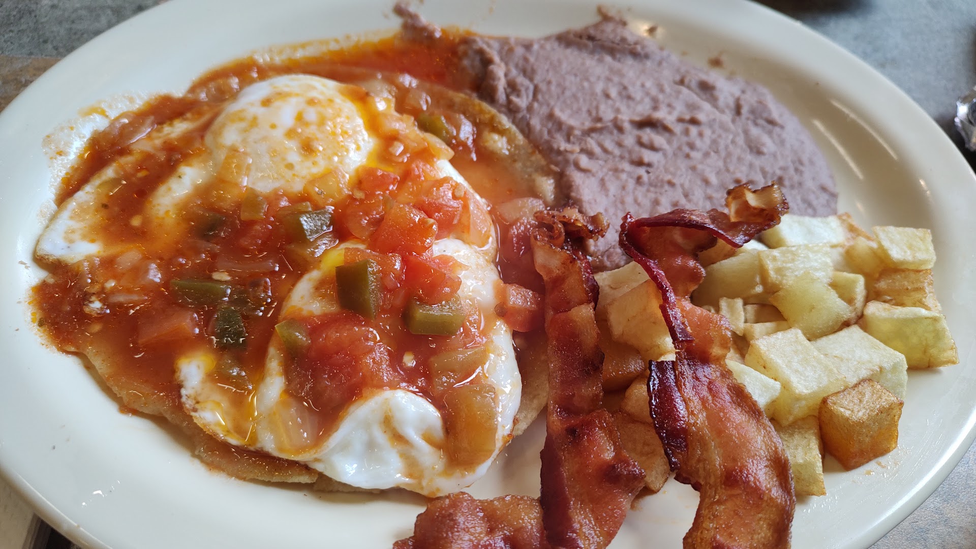 The breakfast options here are plentiful, many options aren't on their menu but they can make them for you, I ordered the huevos rancheros and for $8.49 you get 2 eggs, fried corn tortilla, refried beans, bacon & potatoes.