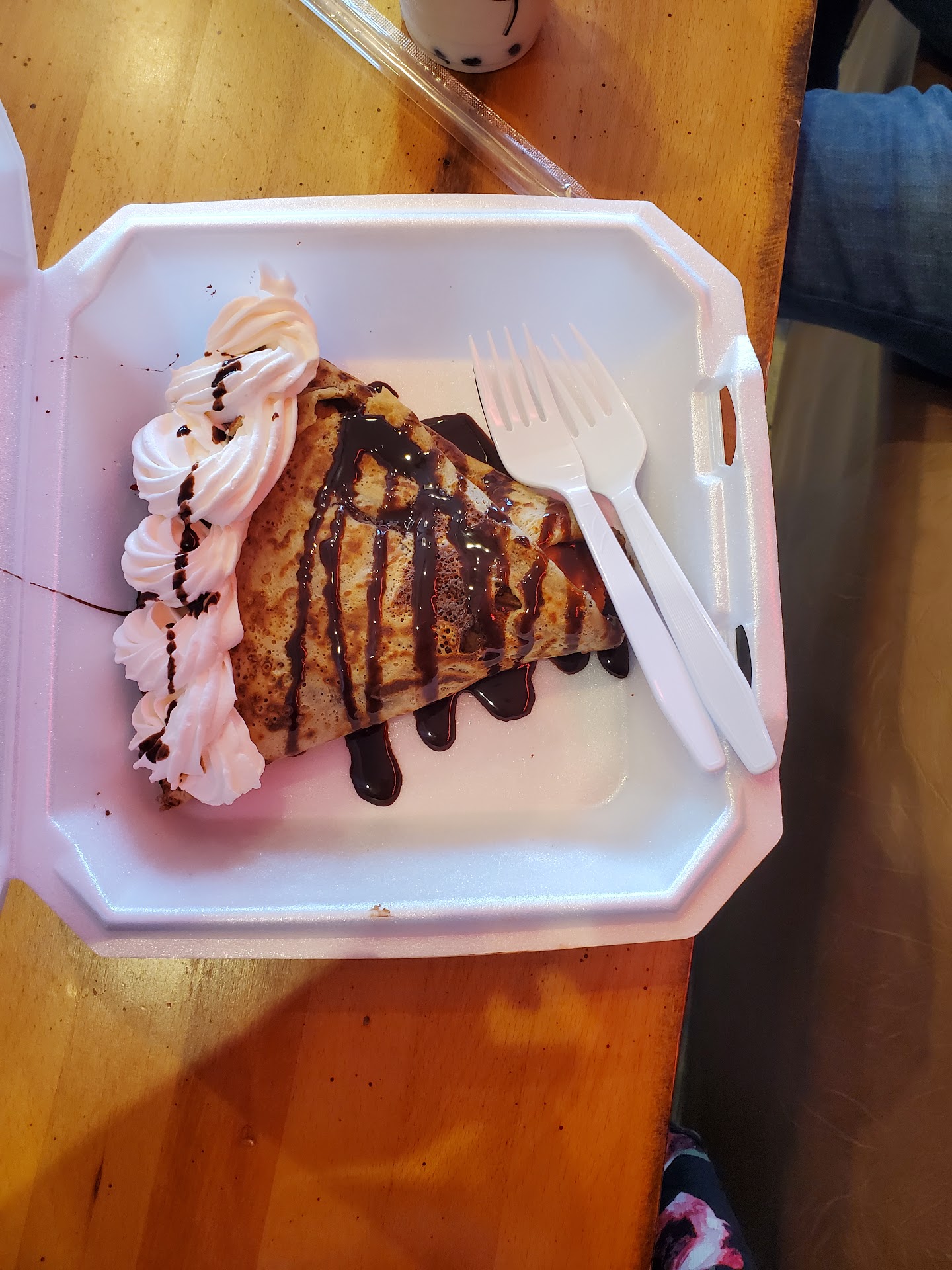 I had also ordered a water, but it was never brought to me until I asked for it. The overall service felt rude and inattentive. On top of that, I noticed the person making my crêpe was texting on their phone, not wearing gloves, and touching my food directly, which felt unsanitary.