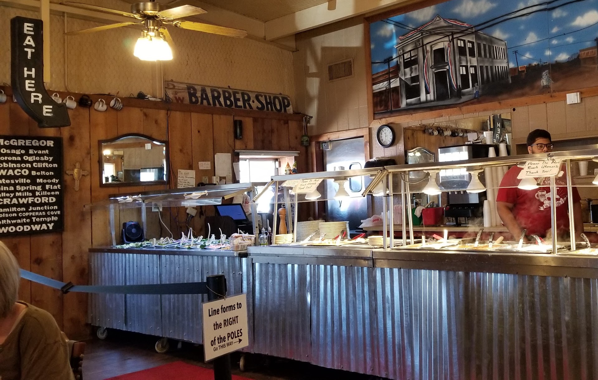 Stopped by, for a second time because it was decent last time we came through McGregor. Will not go back again. I asked for a buffalo chicken sandwich with Ranch, without fries. I wanted a side salad, instead, and had no problem paying extra for for it. When my sandwich came, I asked about my salad. She said, "oh,you can get that at the salad bar." Had I been told earlier, I would have cancelled it knowing I had to go to the salad bar myself (we just came in from hiking a nearby state park, and I wasn't very presentable. Had I know I had to get up, I would not have ordered the salad). And the fact she asked me what dressing I wanted on my salad when I ordered made me wonder why she asked, if she knew I was supposed to go to the salad bar myself?? When we rang out, the person cancelling the salad seemed so put out he had to cancel a salad. He didn't ask how things were with our meal...nothing. The sandwich was brought with a small soup bowl of ranch. I kind of questioned that, but when I could not eat the sandwich because it was soaked in so much buffalo sauce, I was happy to be able to cut the sanwhich and dunk each bite in ranch to kill the taste of so much sauce. Moving on to my husband's meal. He ordered an omelette that was supposed to come with hash browns, or fried potatoes (thin poptaoes grilled, not fried.). History meal was delivered and the omlete was so small, and no hash browns. He asked if the menu had said hash browns with the meal, just in case he was mistaken. She said, "yes, but I just didn't think you wanted them.". ???? She never asked him about them, so I guess the menu is at the waitress' discretion? She only came to our table when it was time to get the check and take the plates. Needless to say, was not as good as the first and definitely uncaring staff. Saddened because we really liked this...