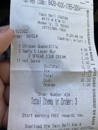 Read moreNo pride in their work! Half hearted, sloppy and annoying.. Burrito half wrapped, ground beef undercooked or not kept at proper temperature, crave box ripped with poorly wrapped contents, chalupa half wrapped with contents spilled inside the bag, quesadilla not cut properly. ..not a busy drive thru! No wonder the 3.4 star rating..Get your act together.. Manager on duty, Carmen.