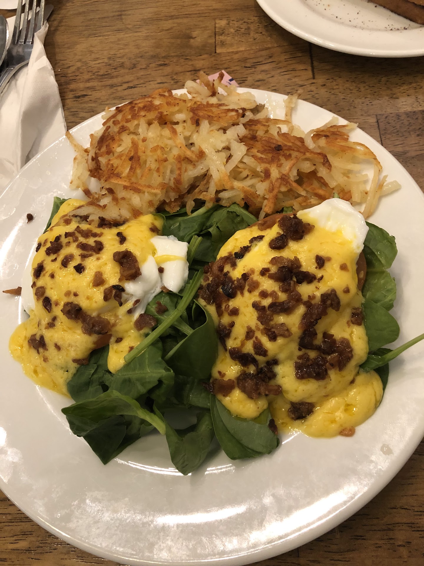 My husband ordered the Florentine Benedict- Freshly sliced tomatoes and spinach, covered with hollandaise sauce. I thought it was good. It had the right amount of hollandaise sauce and the eggs were cooked perfect for me. Only slight bad thing was that the muffin was over cooked or something. I couldn’t cut it with the knife. My husband picked it up and bit it.