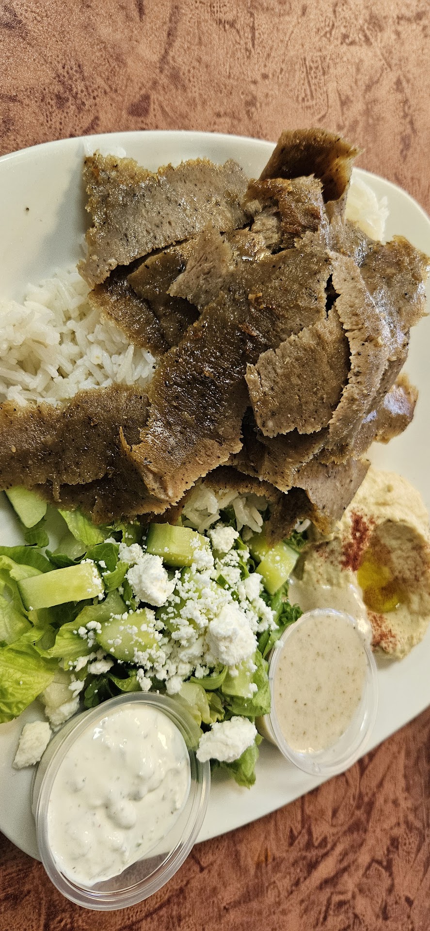 Gyro Plate: Brace yourself for flavor fireworks! Tender slices of seasoned meat snuggled in warm pita bread, surrounded by fresh veggies and that tangy tzatziki sauce. It's like a Mediterranean hug for your taste buds.