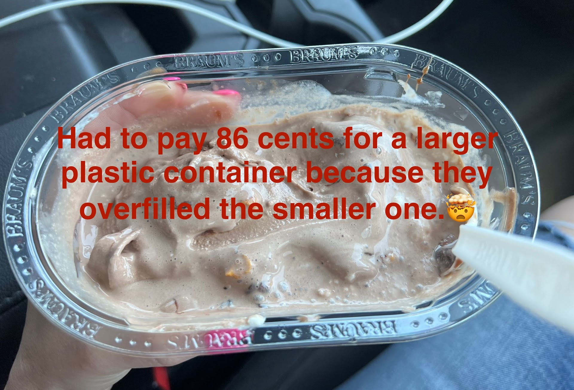 Read moreI ordered a single scoop Sunday. However, it was packed too full and leaking a little. I knew the minute I took the lid off, it would be a huge mess. I asked an employee for an EMPTY larger cup/container to transfer my ice cream into to prevent a mess. This employee (who happened to be the asst manager) said “we charge for another cup.” I was shocked because 1) I was not the Braum’s employee who overfilled my ice cream Sunday 2) This situation was not my fault 3) Why would you charge a customer for something that was not her fault. My husband ended up paying 86 cents for a larger container for me to transfer my overfilled ice cream Sunday. While paying, the assistant manager says,” yeah I need to tell the kids not to overfill .” (By kids, I assume she meant the teenage staff) I felt like I was in the twilight zone because her statement defies the logic of charging me for an empty larger cup/container. Make it make sense?! The ice cream was great, but only 2 stars because your assistant manager lacks common sense and has poor customer service skills. I would like to reiterate this isn’t about a mere 86 cents. It’s the principle of charging a customer for something that wasn’t her fault. I could understand if I asked for extra toppings, but I legitimately asked for an empty slightly larger plastic cup/container to transfer my overfilled single scoop ice cream Sunday because an employee overfilled it. Thus, it...