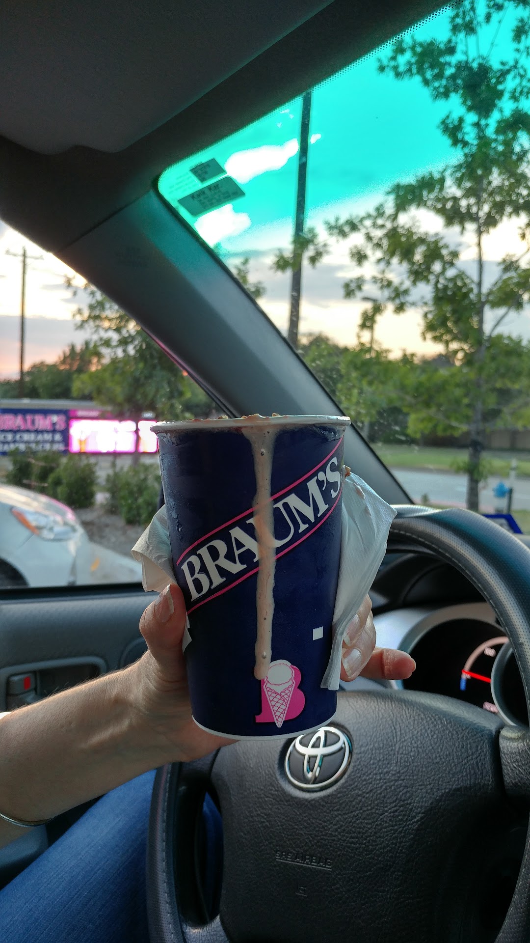 Read moreBraum's is always good! Customer service at this one - - not so much. The girl handed me my Mix with melted ice cream and strawberry juice running down the sides. (I don't mean a little bit either. It covered all the surfaces of the cup! I understand it's very hot and I didn't say anything about it being half-melted but you think she could at least have handed it to me cleaned up.)