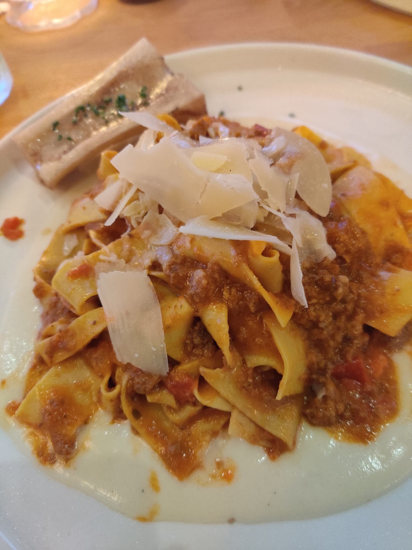 We ordered: Beef Bolognese with tagliatelle: flavor is very good, the bone marrow we got was quite small, about 3 inches, so not as large as the other guests, but it was delicious. I would recommend that this dish does not need bechamel, but instead cook the Bolognese for longer and develop a deeper profile. I REALLY appreciate that there is no pork in this, so us non pork eaters can have this dish. Lamb ragu with Pappardelle - this one in my opinion needs a total revision. It was far too mild, and I really don't think this was a ragu recipe. Chef used cinnamon or another sweet aromatic which made the dish fall completely flat on top of the mild flavors. I understand that you can't have two dishes that are similar but I do invite chef to revisit this one. foccacia - took over 30 minutes to get this, and it really had no flavor at all, neither did the ricotta. The other food came timed perfectly well. Tiramisu - not sure if this is made in house or outsourced, as the coffee used was quite bitter. It softened on the 2nd day but overall a good tiramisu