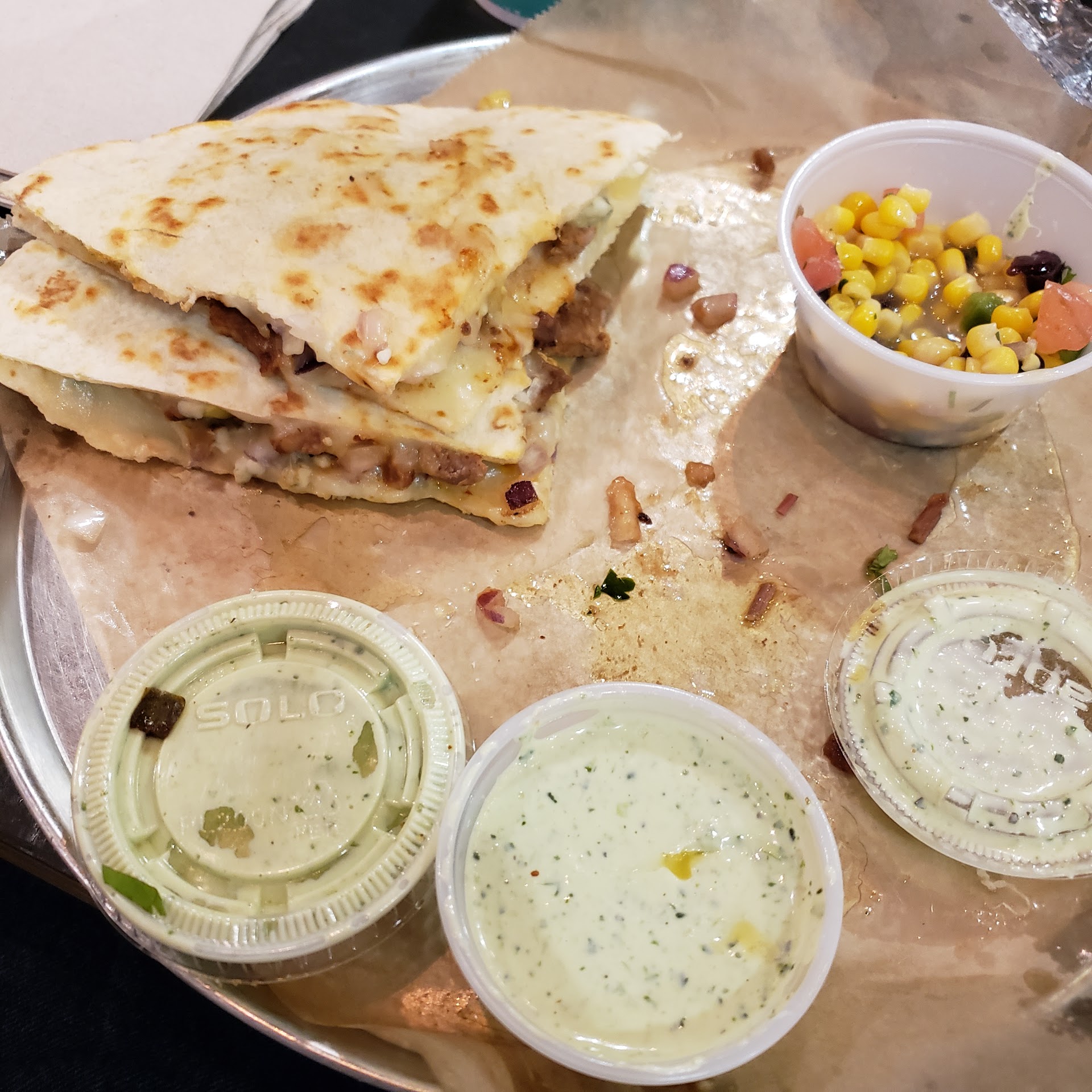 Read moreUpdate four years later: rating went from a 4 to a 5!! ⭐⭐⭐⭐⭐ I ordered the lone Star and oh my gosh I have never had such a delicious quesadilla before. It had a sweet BBQ taste in the undertones along with a savory cilantro. It was sweet savory and the meat was juicy and the sweet onions really added another level. Dipped in the jalapeno ranch sauce, it was creamy and refreshing. The food was hot and fresh as well. The chips and salsa were delicious as well and I liked the sprinkling of the sweet BBQ flavored powder on the chips. The salsa was also fresh with a lot of cilantro and lime flavor. And even the cup of water they gave me seemed filtered and not out of the tap. If you've never been here and you're trying to find some new delicious food I would suggest it. The price is a little steeper than a normal Mexican food places but I think it's worth it.