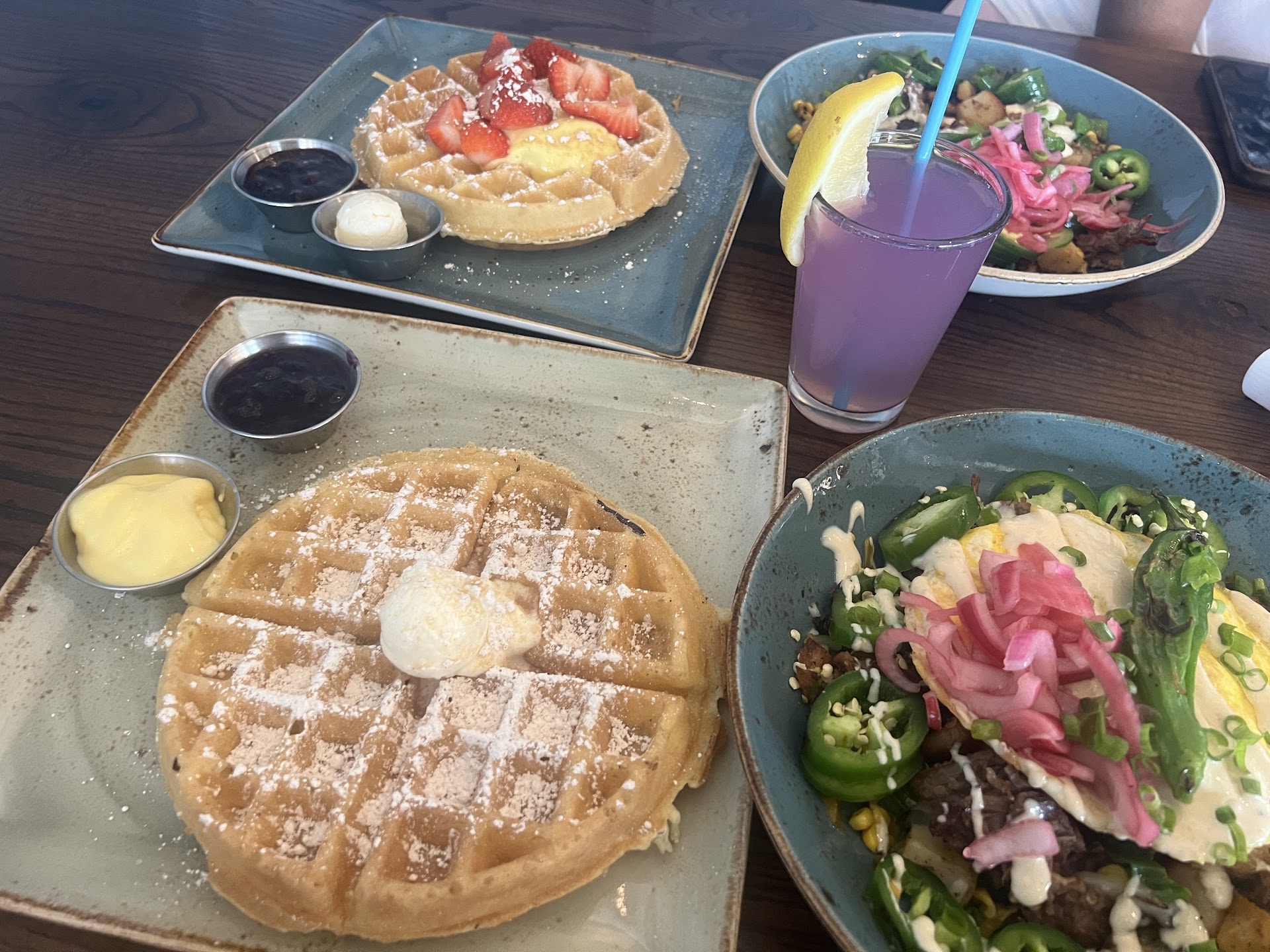First I’d like to say the customer service I received from my waitress on both occasions, has been phenomenal. They have Lemon Ricotta pancakes, that come with the lemon ricotta, powdered sugar and strawberries. I do not eat pancakes, but my waitress was more than accommodating with getting those ingredients put on a Belgian Waffle, with a Blueberry Puree kind of sauce on the side. I also ordered the Shishitso Brisket Hash, which wasn’t bad but the waffle stole the show! Lastly that Purple Haze drink is simply amazing and refreshing…. I have to fight with myself, not to order two 😩