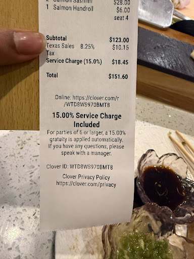 While we were seated and eating, the staff was pretty distracted the entire time and focused solely on a couple sitting on the other end of the bar. I'm assuming it's because the couple were taking pictures of the food to be posted online. But even so, there are still other customers in the restaurant. We were kind of just left sitting there, waiting for the staff. I watched a staff member make our rolls before grabbing a cup of sake and walking straight back to the couple to chat. The father of a family across from us was also watching the staff. Not only has this service been disrespectful to the other customers, it's also unprofessional.