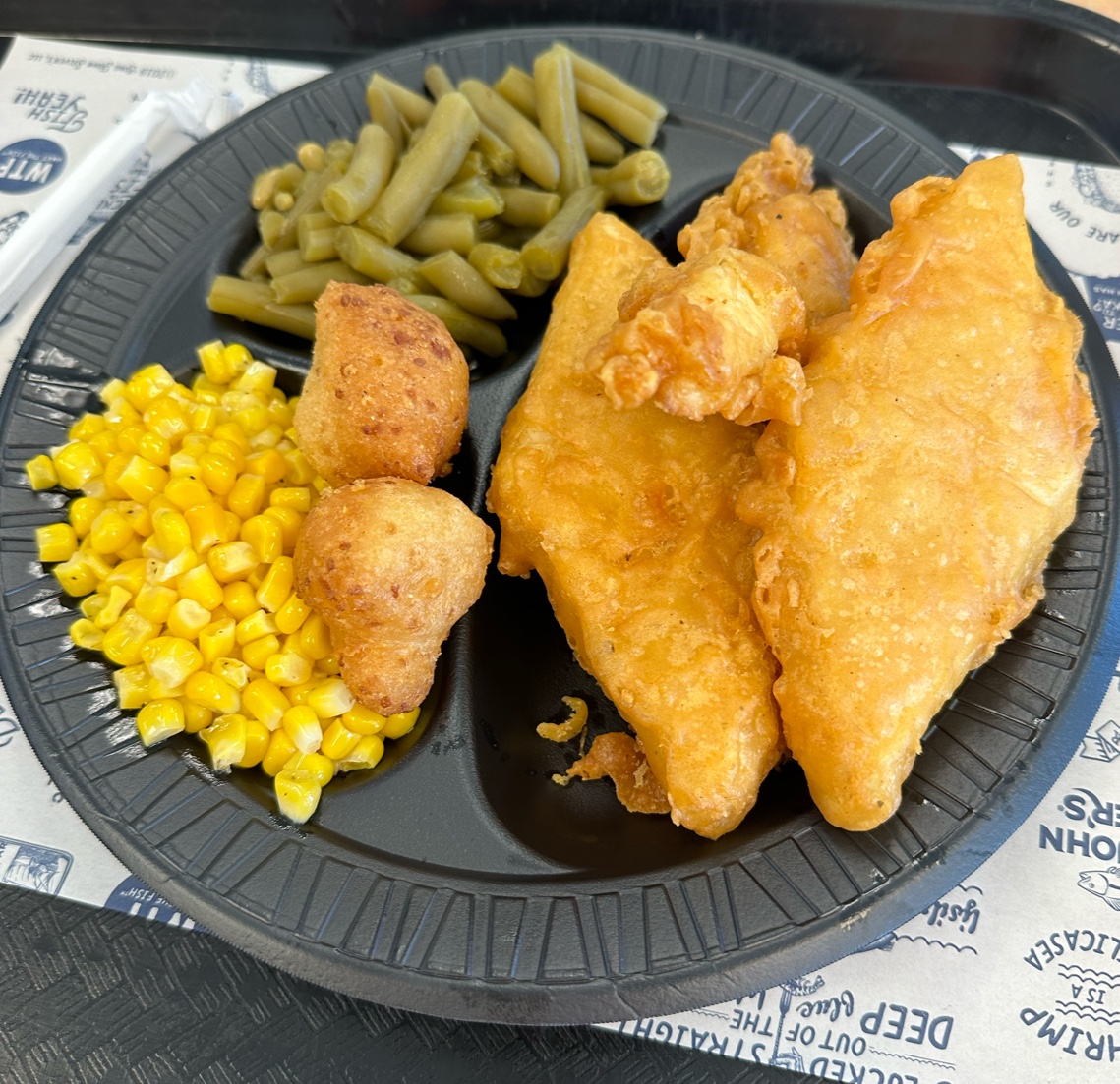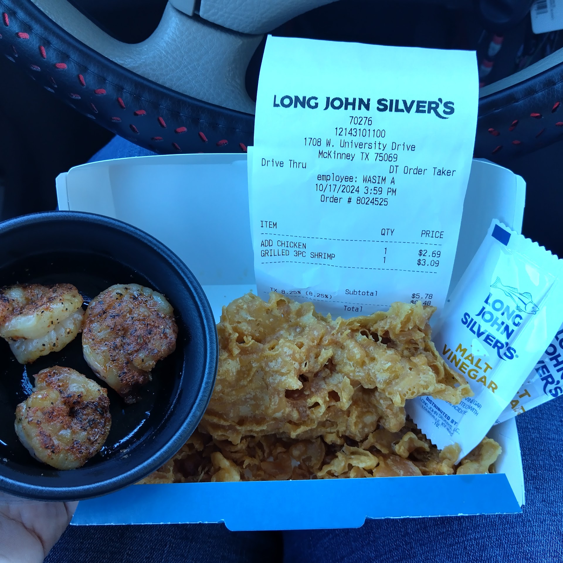Read moreIt's nothing extravagant to talk about. I haven't actually eaten here in like a few years not this particular location but just Long John silver's in general. I realize that my childhood made food taste a lot better than it does now. I guess I was trying to spark up my childhood nostalgia for a little bit. But upon further inspection, this food chain is just overly expensive and the portions are too small. Paying a little over $6 for a few items is not much and I'm still a little hungry. For one the breading is so thick on the chicken that it's kind of impossible to feel like I actually ate a piece of chicken. That whole Chunk in the picture of the chicken, on the top was just breading. Also it seemed like they found the three smallest pieces of shrimp in the building and decided to use that. The shrimp is dusted with Cajun seasoning but it seems a little too salty for my taste. At least they cook the shrimp decently but it's tiny.
