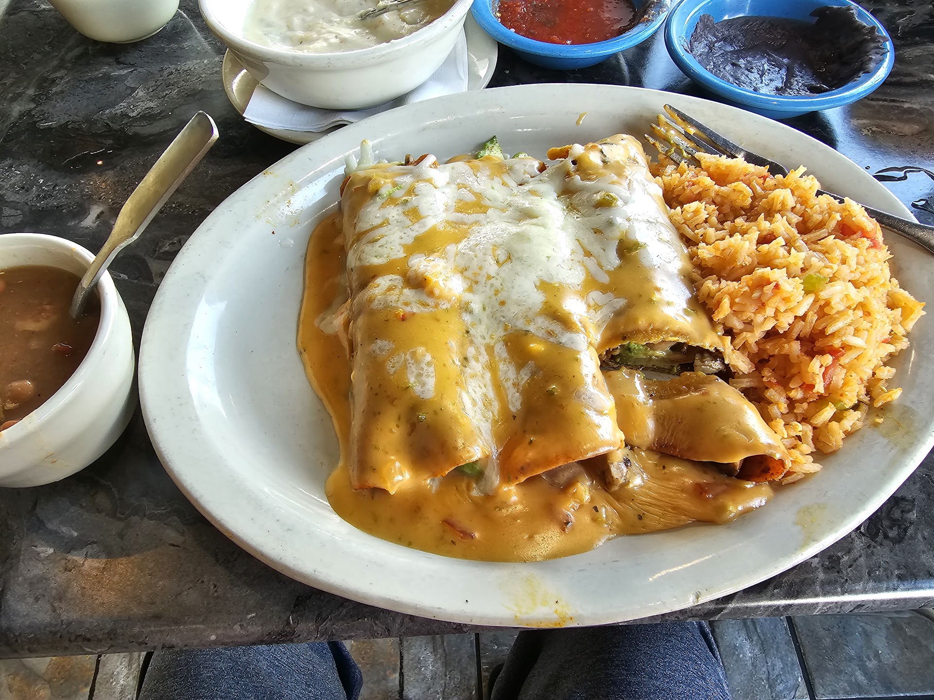 Read moreThey don't just bring salsa to your table, but also mashed black beans that pair nicely. Their tableside guacamole is good but unless everyone is eating it, it's more worth the price to just get a small side of guac with your meal. So far, I've tried the spinach enchiladas, chicken enchiladas, cheese enchiladas, beef taco, taco salad, and pork tamales. Everything has been satisfactory and I look forward to trying their fajitas and street tacos next!! Great service, friendly and attentive staff, and they didn't bother us at all to leave at 10pm when they closed and we were still enjoying our meal. I haven't tried the alcohol yet myself, but on Father's day they gave my brother in law a drink on the house! Overall, I keep wanting to go back because I want to try everything on the menu (not one thing doesn't sound appetizing to me). AND I almost forgot the best part is they serve breakfast food ALL DAY! I'd recommend the place to anyone. Obviously it isnt cheap like fast food, but it IS...