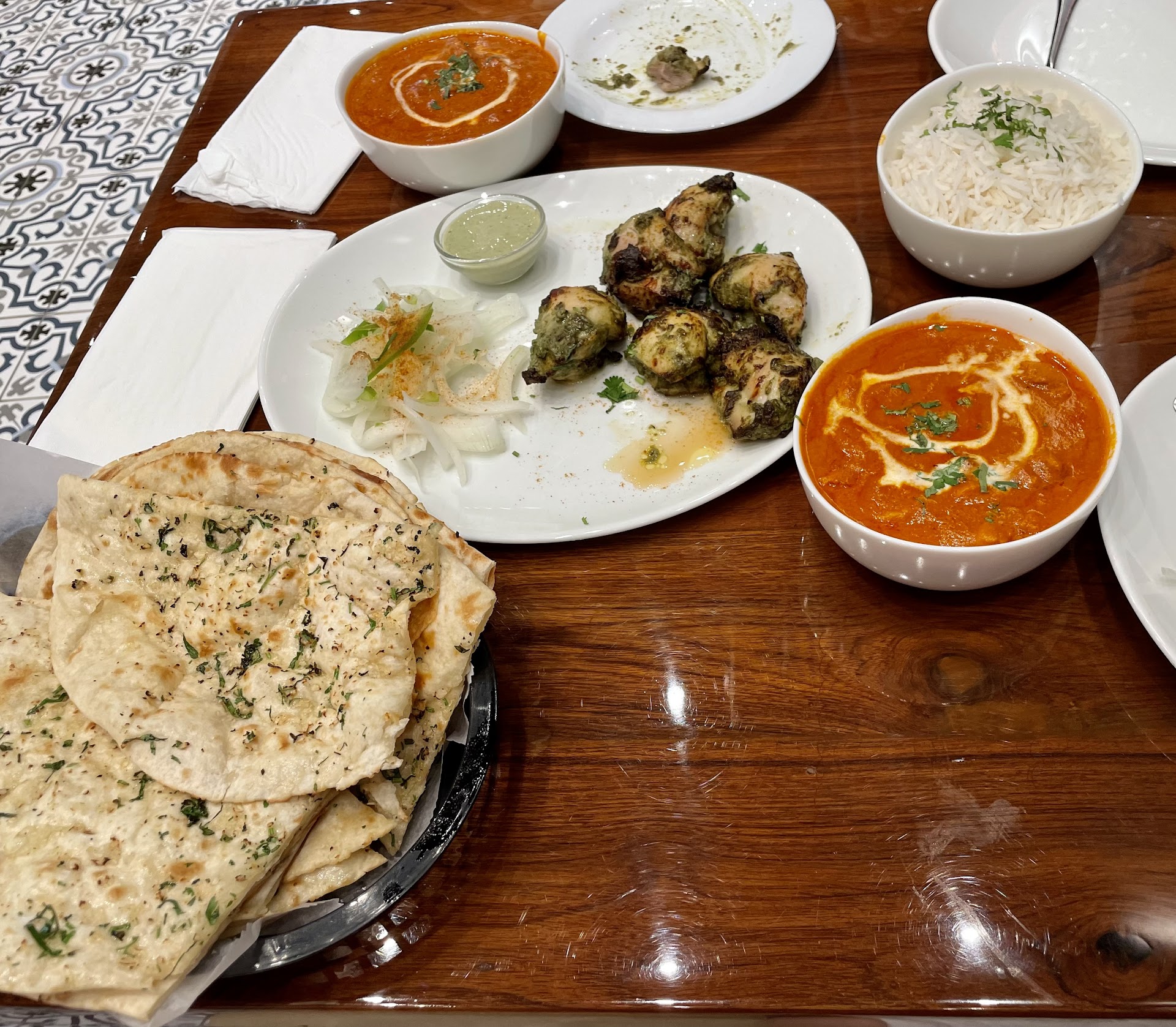 The samosas were hot a crunchy and the tamarind sauce is the perfect amount of tart and sweet. The Vindaloo took me by surprise with the spice level, I was sweating the whole time but I could not get enough. The rice was perfect, every grain perfectly exasperated and not dry at all. My wife's dish was equally satisfying. Plenty of chicken and the masala was super tasty. Cant have Indian food without Naan so we got the garlic. My wife is tiny so she does not eat much and the naan and rice was too much for her so that was all me. Her loss. Could have had a bit more garlic for me but it was still very good.