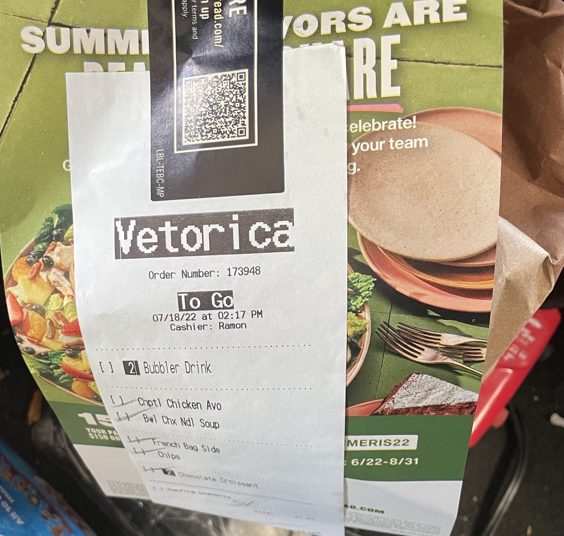 Once we get home I find out that my salad had been prepared horribly. I ordered the Southwest Chile Lime Ranch Chicken with no chicken, per my order as I always do! The avocados we're very brown and should not have been served to anyone. The salad did not have the feta cheese and the adobo corn blend. I also ordered the 10 vegetable soup (first time ordering) and it was delicious!