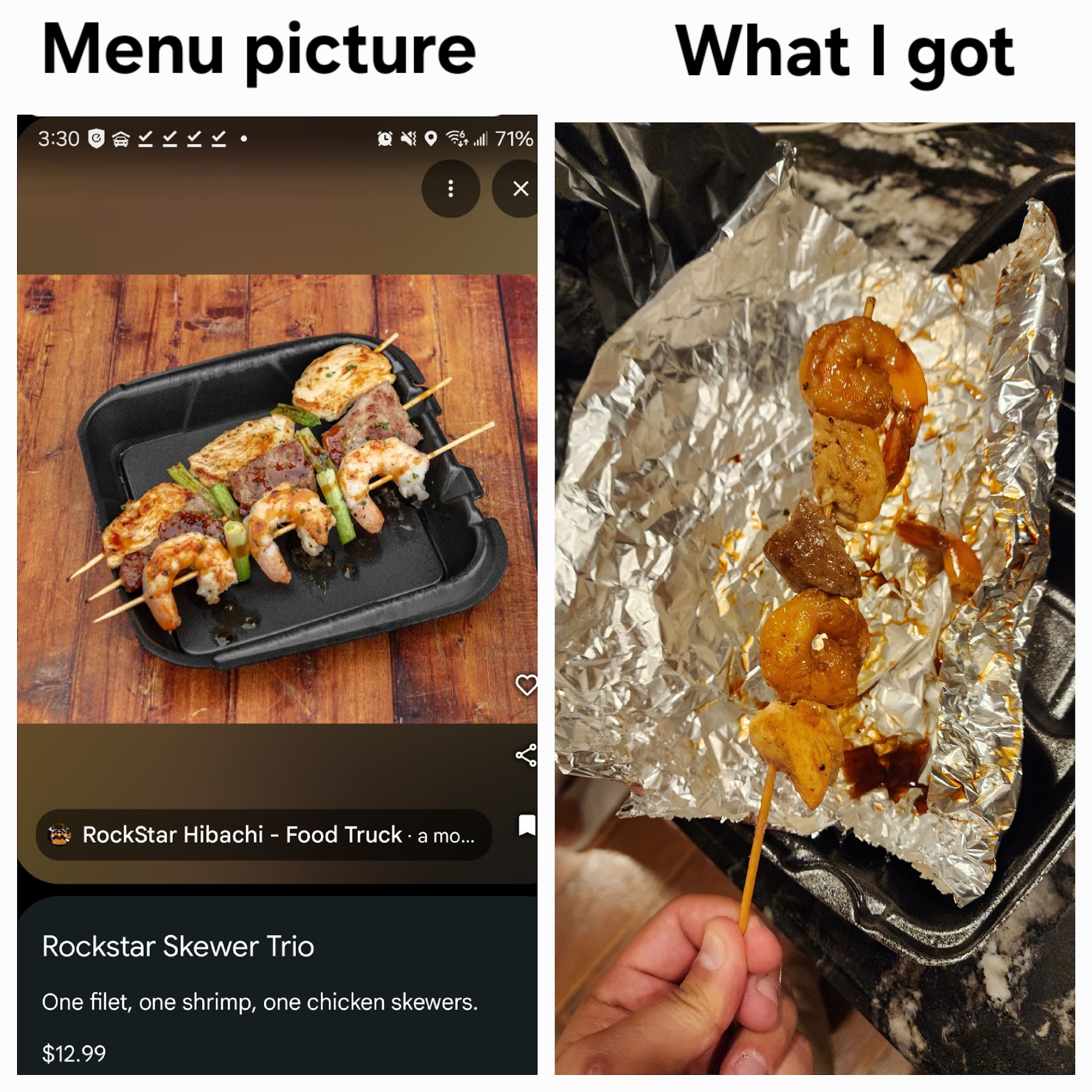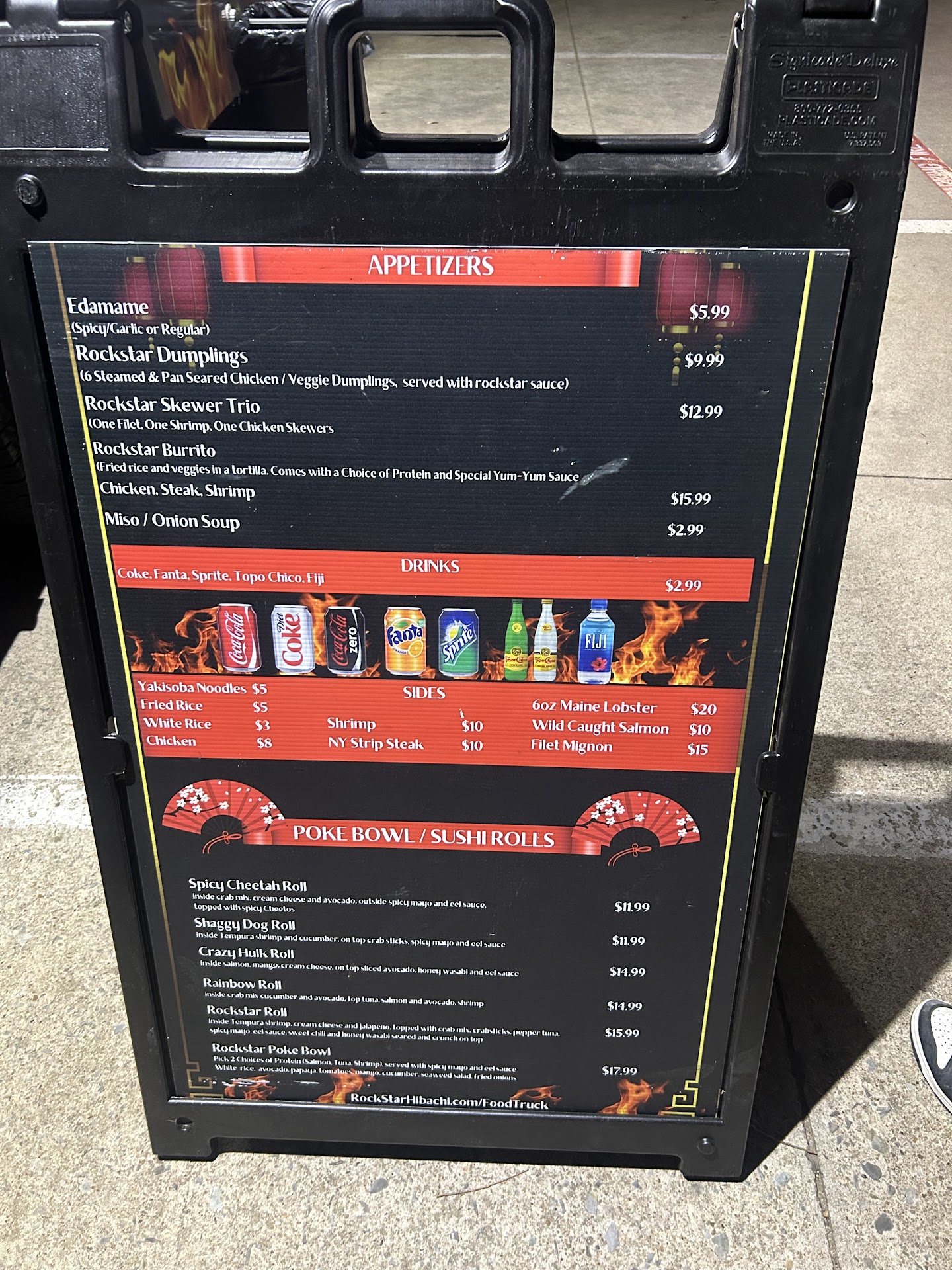 I was mostly excited for the "Rockstar Skewer Trio" as it reminded me a bit of Brazilian Espetinhos, so I ordered the Skewer Trio, teriyaki chicken and yakisoba. When they handed me the bag of food, it felt unusually light for the amount of food I was expecting. When I got home, I was IMMEDIATELY disappointed with EVERYTHING that I got. The teriyaki chicken was so dry and barely had any food in the plate. The yakisoba portion was tiny and tasted and felt like chewy rubber bands and the biggest disappointment was the Skewer "trio", that I only received a single Skewer (Albeit it did have 3 pieces of each meat) with the smallest pieces of meat I had ever seen, rather than 3 separate skewers full of meat as shown in the menu pictures. All of that for nearly $40! I ended up ordering take out from a different place and threw it all away.