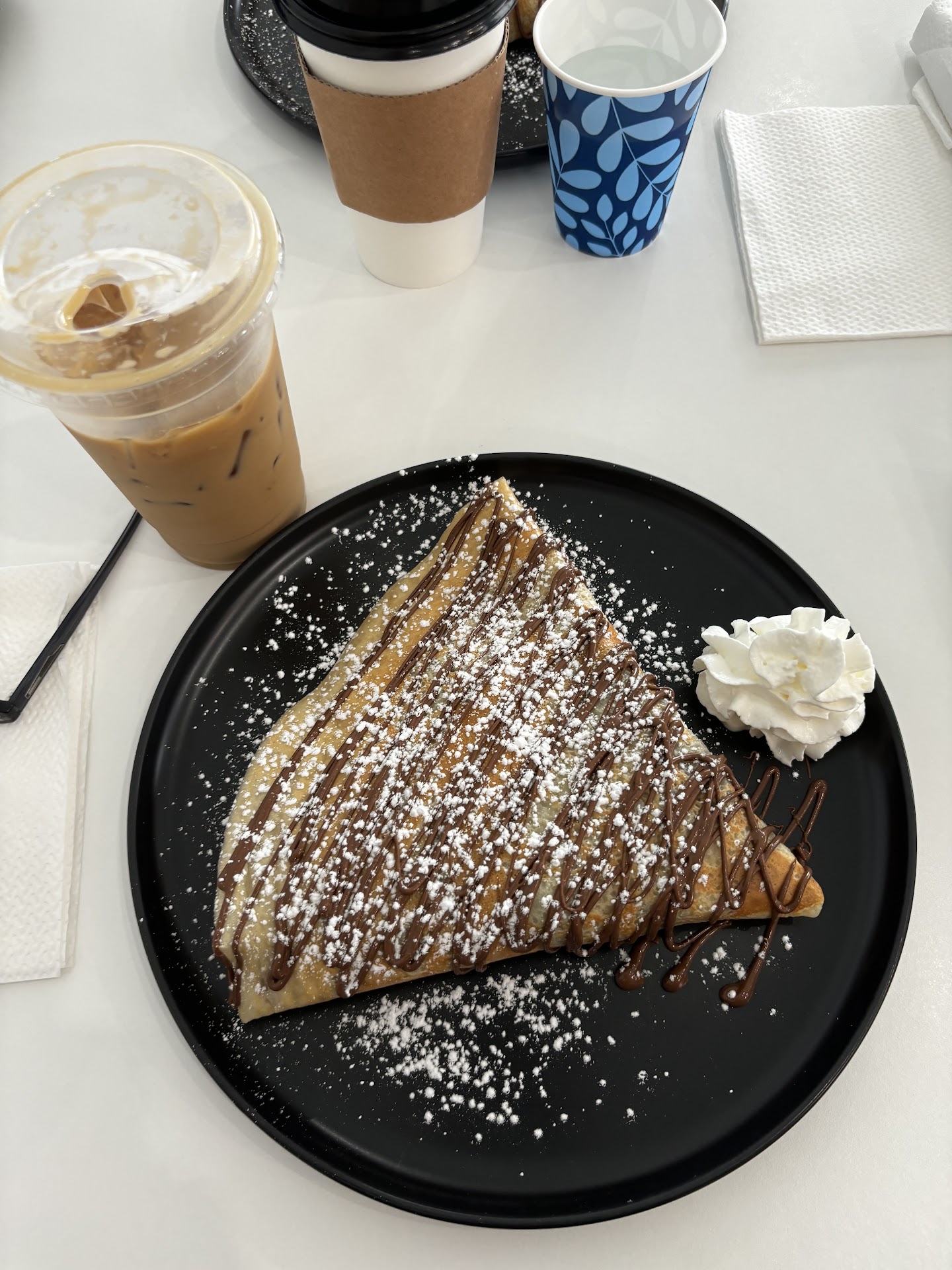 Pairing perfectly with the crepe is their delicious iced coffee, which is smooth and refreshing, providing just the right kick to balance the sweetness of the dish. The rich flavor of the coffee enhances the overall experience, making it an ideal match.