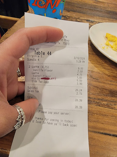 Read moreBad experience. We went there to feed my little son only, so I ordered 3 coffee lattes, 2 scrambled eggs and a kid's Apple juice, I'm sure I would never order an orange juice because my son doesn't like it, the server brought a K-OJ and as soon as I took the juice I told her that I wanted apple juice, not orange, she insisted that I order orange, she exchanged it for me immediately but on the check she charged me for it as k-orange juice.