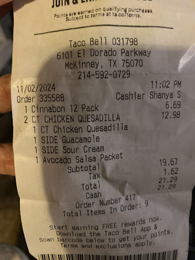 Read moreThis location sometimes have issues with not having employees. I went through drive-thru one night around 9 - 9:30 pm. There were only two cars ahead of me and I noticed they sat at the intercom for maybe 1 minute then proceeded to the window and slowed down but did not stop and just left. Both cars did this and I assumed Taco Bell was out of an item the customers wanted. I'm now at the intercom and no immediate response. After 1 minute, a young lady says, "I'm not taking orders because I am the only one here."