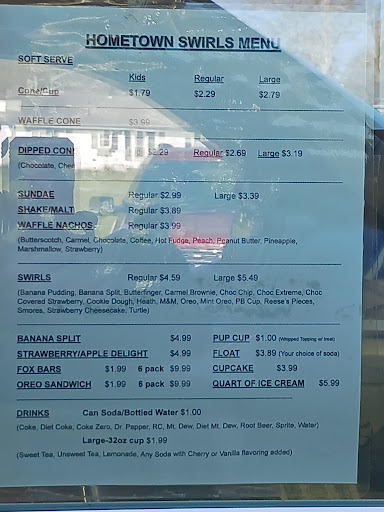 Read moreMy granddaughters and I stopped at Hometown Swirls and bought 8 ice cream cups. We ordered orange, vanilla and chocolate flavors, they were so good. We took them to my granddaughters softball game. They were messy, but nothings better than ice cream...
