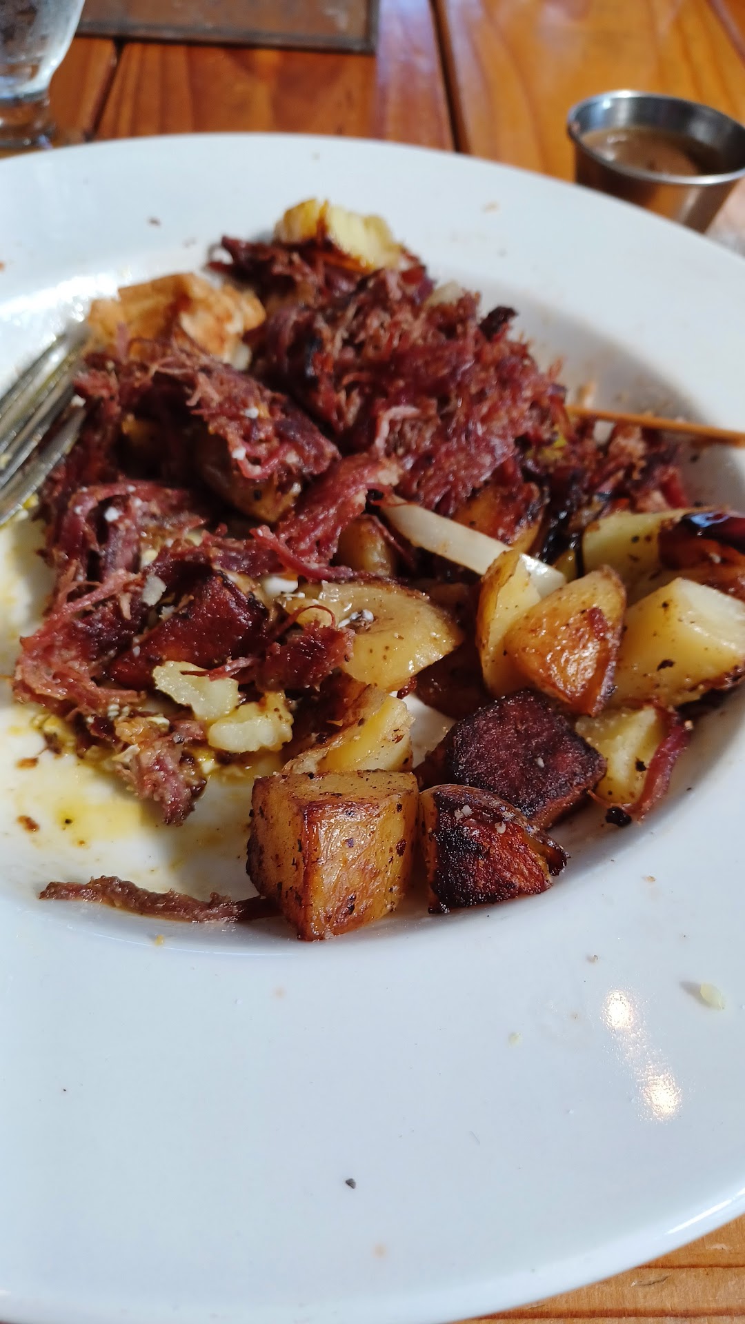 The hash was a ten. The meat was fried with potato, onions, peppers, etc. It had a wonderful caramelized rich crispness to it, and my egg were perfectly cooked to order. Delightful