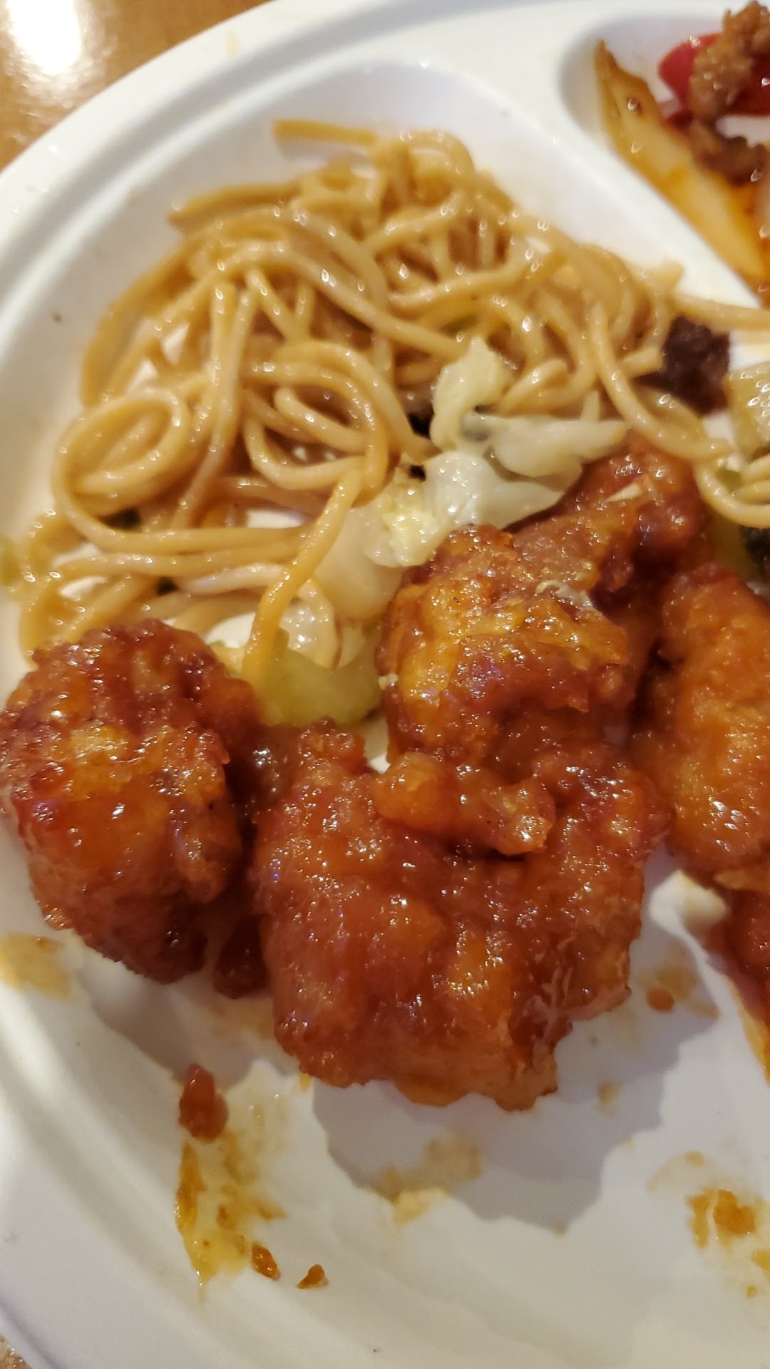 The food tasted ok and the lady was nice but it was 12:30 they only had two dinners eating in. On buffet shut completely down and one full of cold food that nobody really eats. It was gloomy and depressing. They were lacking several dishes u might find at a Chinese buffet with only a small selection of food and it’s sold by the pound. All the dishes looked like they were intentionally created to be as heavy as possible to increase price, extra breading on meat, maybe the meat was injected to look bigger and juicy but increases weight with water or broth, meat with large heavy bones and all vegetables cut thick and large, I paid 21$ for what I got in the photo, it’s mostly rice noodles on the bottom. The orange chicken looked more like orange chicken strips. The taste was good however I felt I got ripped off. The most I’ve paid at any Chinese lunch buffet 17$ and I actually got to enjoy watermelon for desert. The customers didn’t seem to look happy dining here, I think everyone is feeling the same way. If I got some water Mellon I’m guessing lunch would be more like 30$ if I had gotten the pork chops or mor than two chicken wings more like 40$ to 50$. If u can afford a 30$ to 50$ or higher lunch or don’t plan on eating meat or maybe just a scoop of rice then definitely eat here. But i really recommend going somewhere else. I don’t plan on returning here again. If they want to charge by the pound the least they could do is cut it into small pieces and have some light weight options for those of us who can’t afford 30$ lunches. That is not much food, the close up photo makes it...