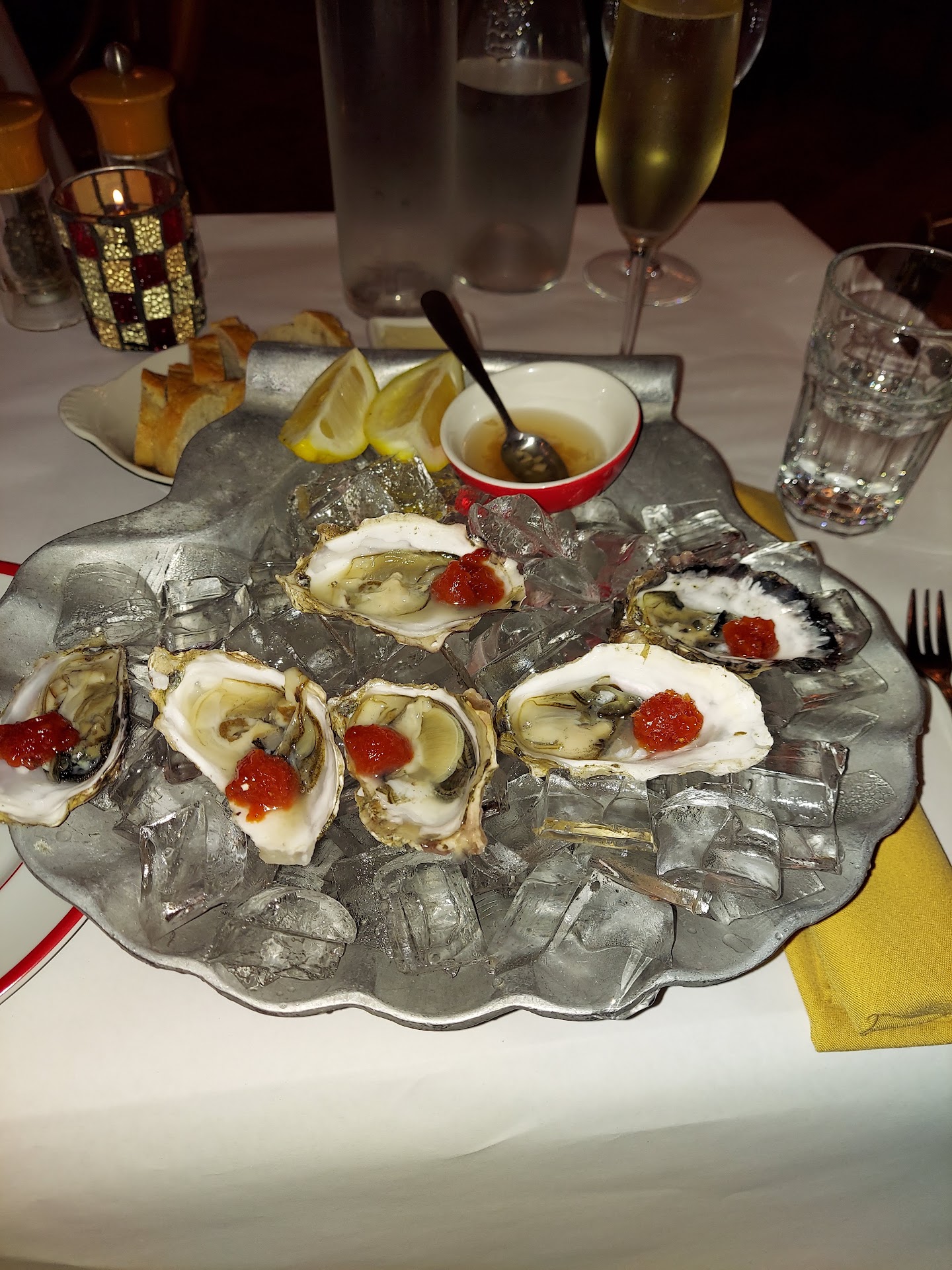 The food was fantastic. You get a basket of classic French bread slices with tasty butter. The Oysters Rockefeller was cooked to perfection with crusty, tasty cheese on top. The onion soup was slightly different than we were used to with a little less bullion flavor. They say it is authentic French and we loved it. The steak au poivre was a ribeye at medium rare and every bite left me craving the next bite. The fries came with a truffle aiole dip that we loved. We couldn't have asked for a better meal.