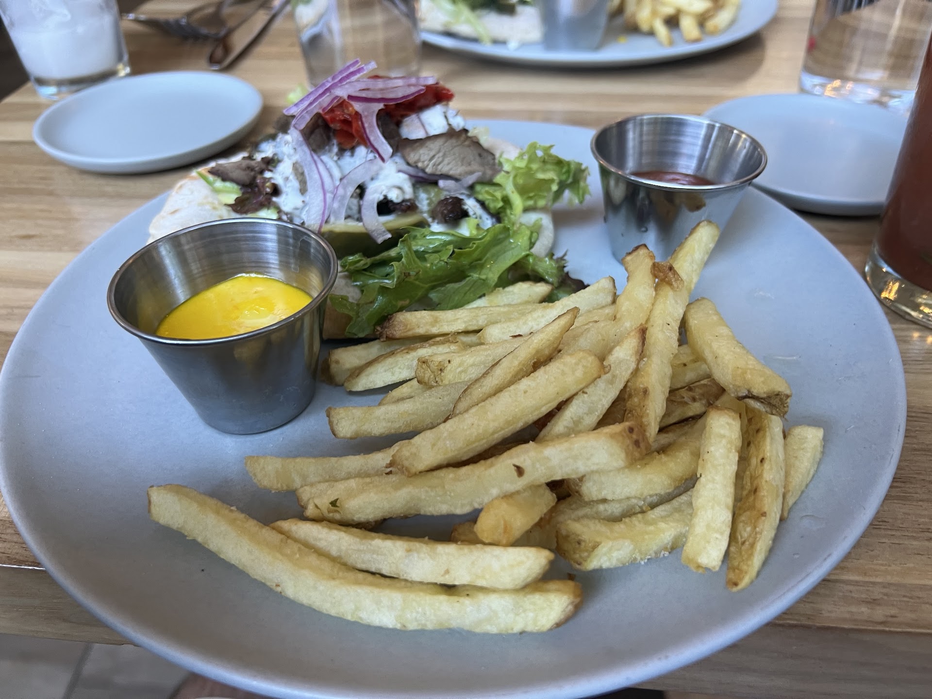 The waitress was apologetic and comped my Bloody Mary which was nice, and a very very good Bloody Mary. I would return just for the Bloody Mary. And maybe just. The wrap itself was far too wet and leaked profusely before eventually succumbing to bottom soak and breaking apart. Though nicely plated it was rather bland and uninteresting, I think mostly because the lamb bits showed little to no sign of seasoning or marinade. The pita was nice. The French fries were deff bought in frozen, and the smalls ones were dry while many large ones were limp on the plate. Like the fryer was turned too low maybe?