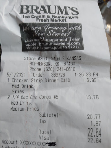 Read moreBraums has good ice cream and we appreciate their lower menu prices compared to other establishments. Burgers and fries are good.
