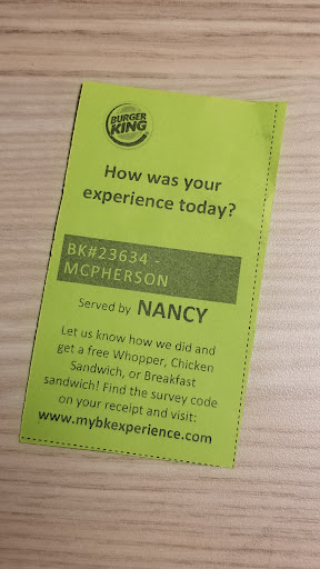 Staff is friendly and food is decent for "fast food". Burger King in McPherson has always been exceptionally slow. So we used to always call our order in (we would order spicy nuggets), and had no problem doing so. Calling it in made it so it was ready when we got there. Unfortunately, there is one manager that request we use the mobile app instead of calling it in. Every time we tried or used the app it either doesn't work or it half way does (usually have to make two separate orders) and then we have to wait 15-20 mins for 20 spicy nuggets. It's ridiculous. If calling it in is more efficient there shouldn't be a problem with us doing so. That said, we will now be ordering from Wendy's, where they don't mind a phone call... which isn't necessary there because you don't ever have to wait very long...
