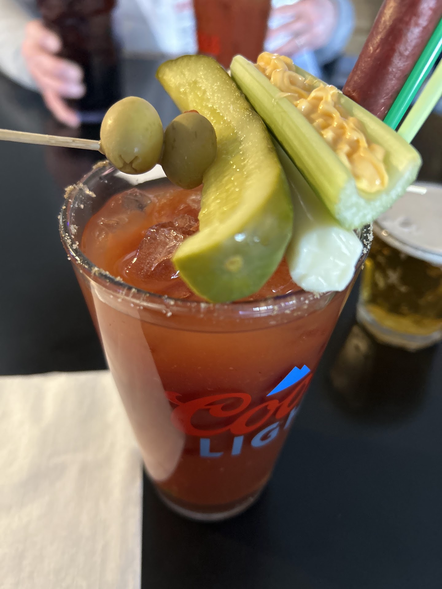 I stopped in on a blistering hot day (97°!!) for a cool refreshment. Owen, the proprietor of the establishment, served me himself. There’s a well-stocked bar, several kinds of beers on tap, a pool table, and plenty of space. The atmosphere was relaxed and friendly; Owen was outgoing, chatty, and interested as any good barkeep ought to be in my esoteric hobby of birding. The person next to me ordered a Bloody Mary and what a fantastic looking drink it was! Flags galore: a smoked meat stick, a cheese stick, pickles, olives. It turns out this Bloody Mary won an award for best in the whole region. The customer did say it was delicious.