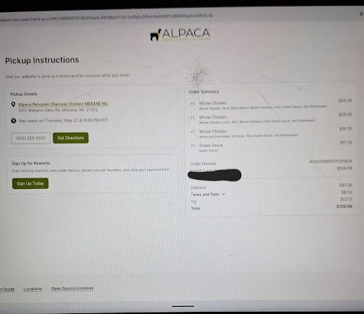 I've been a customer on multiple occasions at the Mebane NC Alpaca restaurant the food is good each and every time. However this time I ordered for a small team gathering at work and decided to make an online order. I ordered 2 whole chicken meals and an extra whole chicken. The meals allow you to choose from their yellow sauce or their AMAZING GREEN sauce. The sause was chosen and an additional a'lcarte 32oz green sauce was purchased for an additional fee. Upon arrival my food was thrown together in the bag it was only the food. The server baggaed my food and said we are out of Green sauce but you can get it yourself from the stationary area. WOW!!! Being that it was my lunch break and almost alpacas closing time, I let it slide due to me not wanting to argue and I didn't want to let my team down for lunch. It's already bad that we have to find decent meals working the late shift. I reached out on the website for them to contact me... No response. I called by Saturday asking to speak to the manager. The GM called me back with his personal number and asked me to send my receipt. I did. It's been almost a week. I have not heard anything. As a people we are not in a space where we can waste or give money away. If you can congratulations not me. I need my money back for an $ 11.79 item I paid for and did NOT get I'm not asking for food or a hand out just what I paid for. But I feel like with no response and me not getting my money back Alpaca in Mebane stole from me. And I'm standing on it until yall make it right. If I placed an order at 1:01pm to pick up at 8:45pm I should have had sauce before you ran out. Not good business. And let's not forget the team members where tipped... So Alpaca...