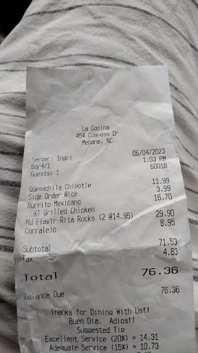Read moreGreat food. Competitively priced. The food is always better when you dine in. When you order to go you get less food and totally screwed over when it comes to salsa for the chips. You get a good size bag of chips when you order to go, but only a tiny cup of salsa, like a little ketchup or nugget dipping sauce size cup! When you dine in you get unlimited delicious salsa, but with to go orders you get one tiny cup with a tablespoon of salsa. When you ask for more salsa, you have to pay for an order of 'chips & salsa' which is still only another tiny cup tablespoon of salsa! I love to eat here, and I love their food. But because they are so stingy with the to go salsa, and never give you more when you order to go, Ive taken away a star. They should at least give a cup of salsa for each to go dish that was ordered with the order since their to go salsa cups are so small. In my house we always fighting over that little salsa cup. Order 4-6 entrees and still get that one bitty cup of salsa. La Cocina if you're listening. We want small soup sized cups of salsa with to go orders please. That's all it will take to make you a 5 star restaurant.. I will also add that eating here was more enjoyable before they moved into the new building. Why the busiest restaurant moved into a smaller building with less parking, I'll never know. Oh and the tamales here are not good at all. Ever. But everything else is great when...