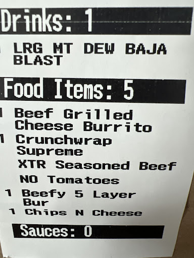 Speaking of which, are the employees here illiterate or just plain spiteful? The meat portions on their food are so small it makes you wonder if theyâre just bad at their jobs or if Taco Bell corporate has cut meat portions by 90-97%. I ordered a Crunchwrap supreme with âextra meatâ paid the dollar extra for it, and this is no exaggeration, there might have been a tablespoon of beef on the entire thing. Maybe even less.