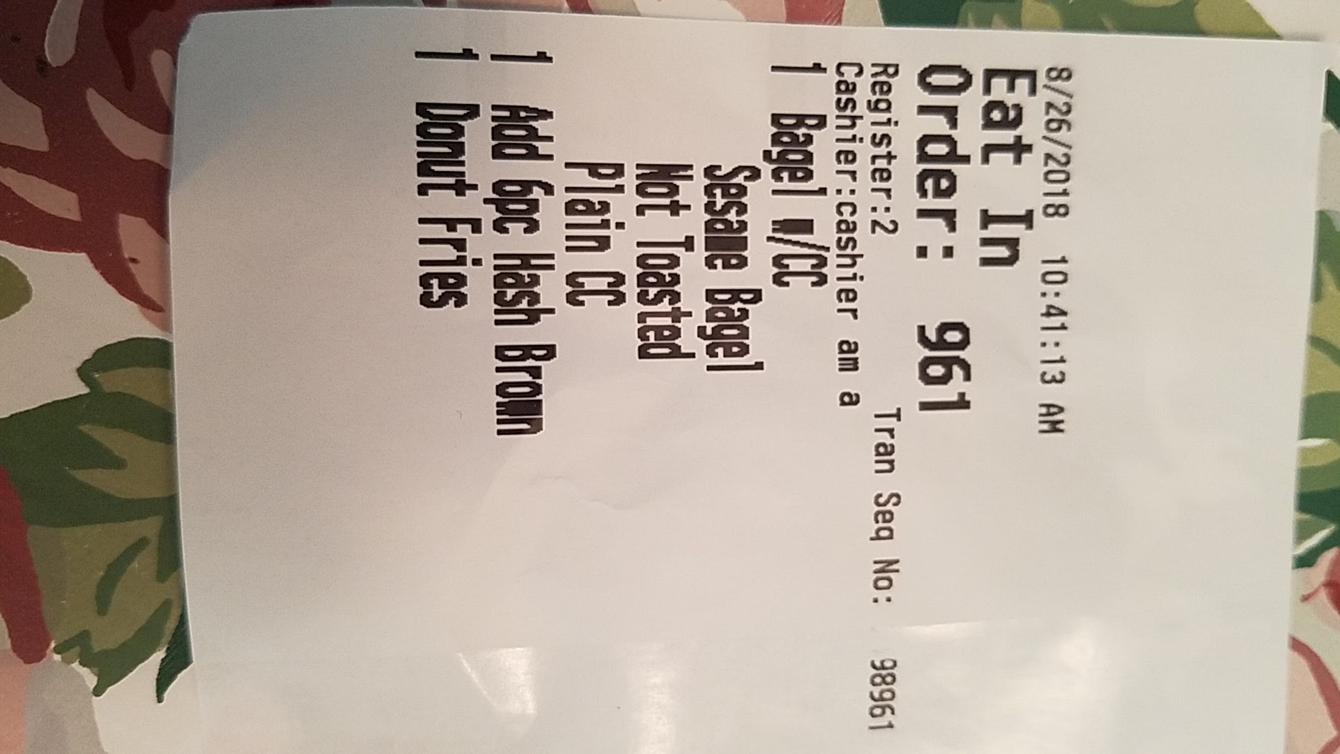 Read moreI keep trying to give this location another chance because it’s close to home and has a drive thru yet they continually disappoint. Today was by far the worst. Placed order at drive thru (how do you run out of ex-large cups?!?), got to window and they got every part of my order wrong. Gave me a coffee when I ordered hot chocolate with whipped cream. Handed me a hot chocolate, no whipped cream and they looked so annoyed when I asked that they add it. Handed me a cinnamon raisin bagel with cream cheese when I ordered a sesame bagel with veggie cream cheese. Had to ring my order up in two separate orders because they didn’t know how to cancel the incorrect order. I’m still not sure I was charged correctly because I wasn’t given a receipt. I called the store to ask to speak with the manager and was told there was no manager in today and she would be in tomorrow. I have been on hold with Dunkin’ corporate customer service for 15 minutes! Avoid this location. I’m never going there again. The location by Traino’s is the best local option. Unfortunately, it’s out of my way to work and no drive thru but that location is consistently clean, friendly...