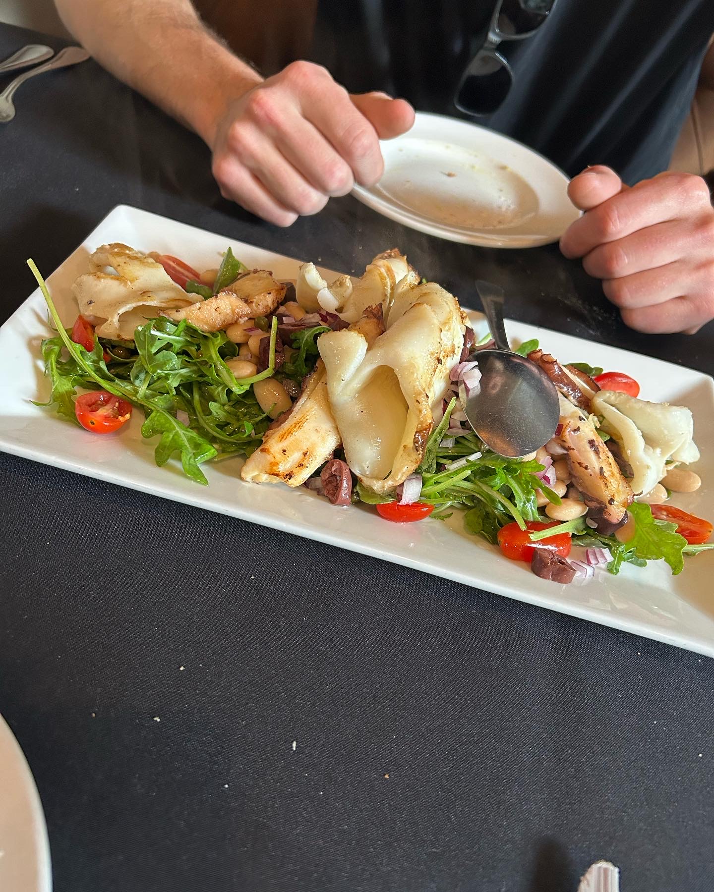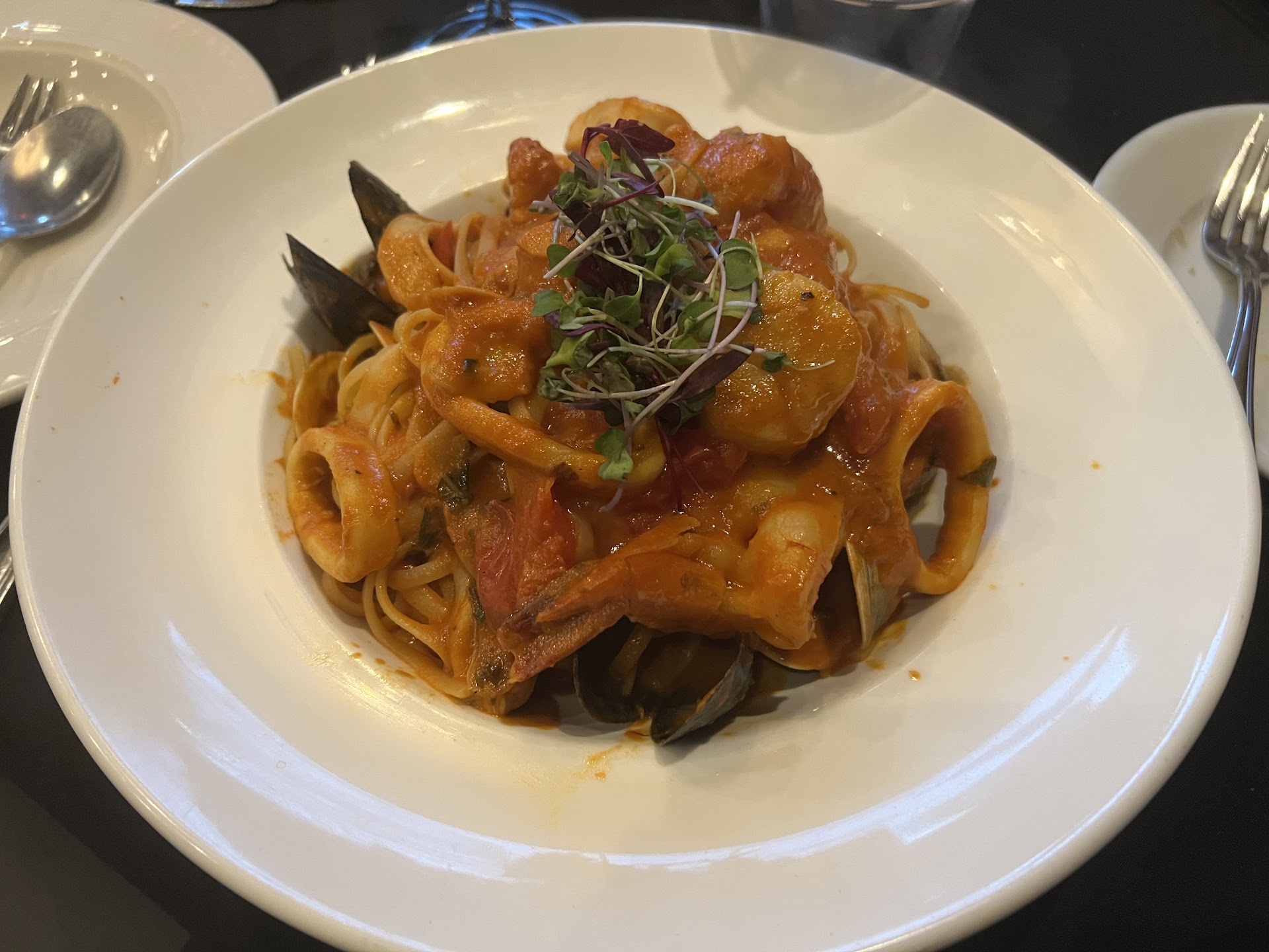 The service was excellent both times, but the food was a different story. I started with the grilled calamari and octopus. The calamari was so tender you could cut it with a fork, but the grilled octopus was like shoe leather.($22.) My second appetizer was the Portobello lobster mushroom special for ($22). It was very disappointing— a tiny mushroom smothered in cream sauce and cheese, with more sauce than mushroom, and the flavor was underwhelming.
