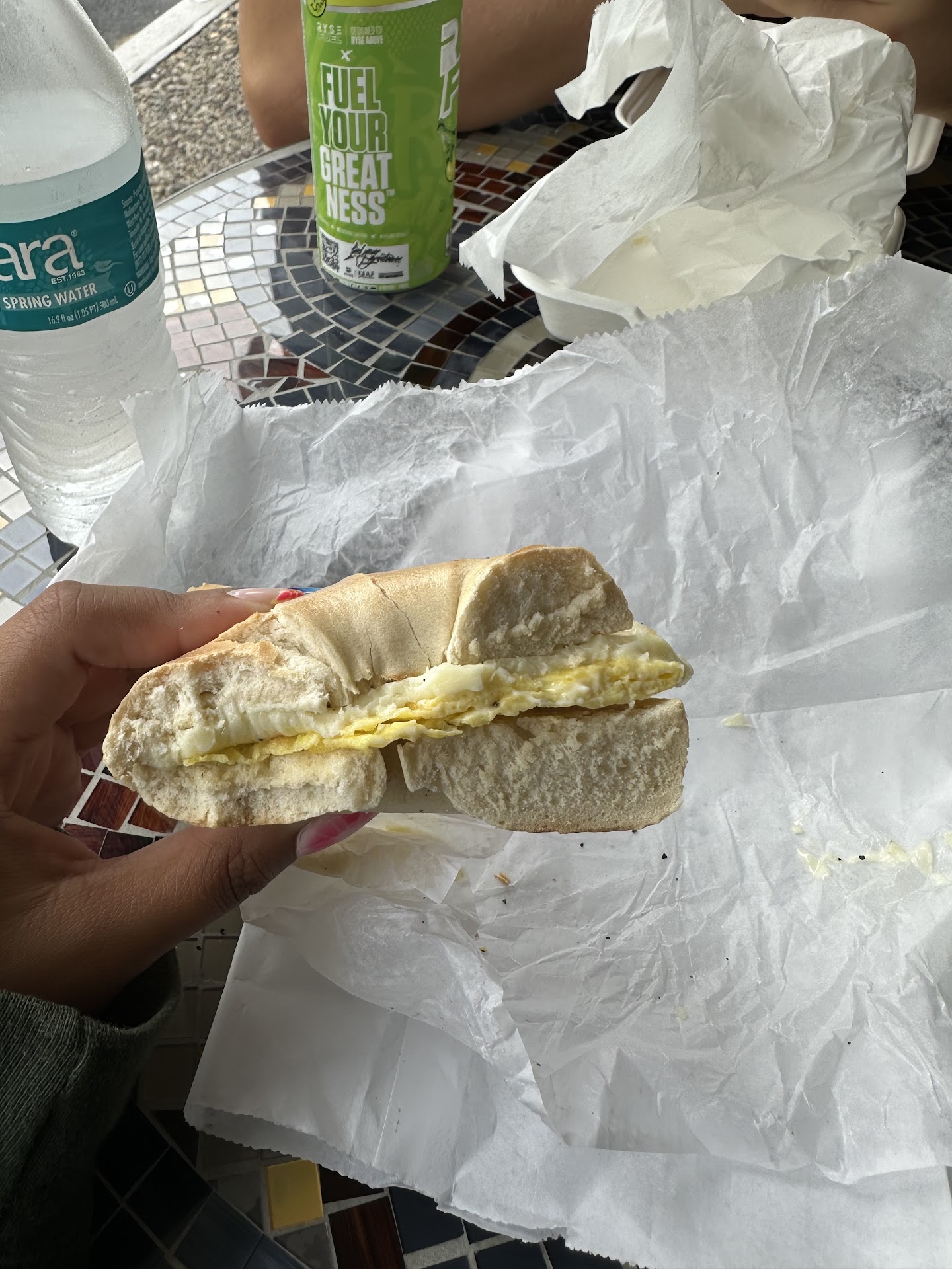 Items Ordered: -Breakfast Burrito w/ Salt, Pepper, & Ketchup -Toasted Everything Bagel w/ Chive Cream Cheese & Tomato -Toasted Onion Bagel w/ Veggie Cream Cheese & Tomato -1/2 Dozen Mixed Bagels -Veggie Cream Cheese