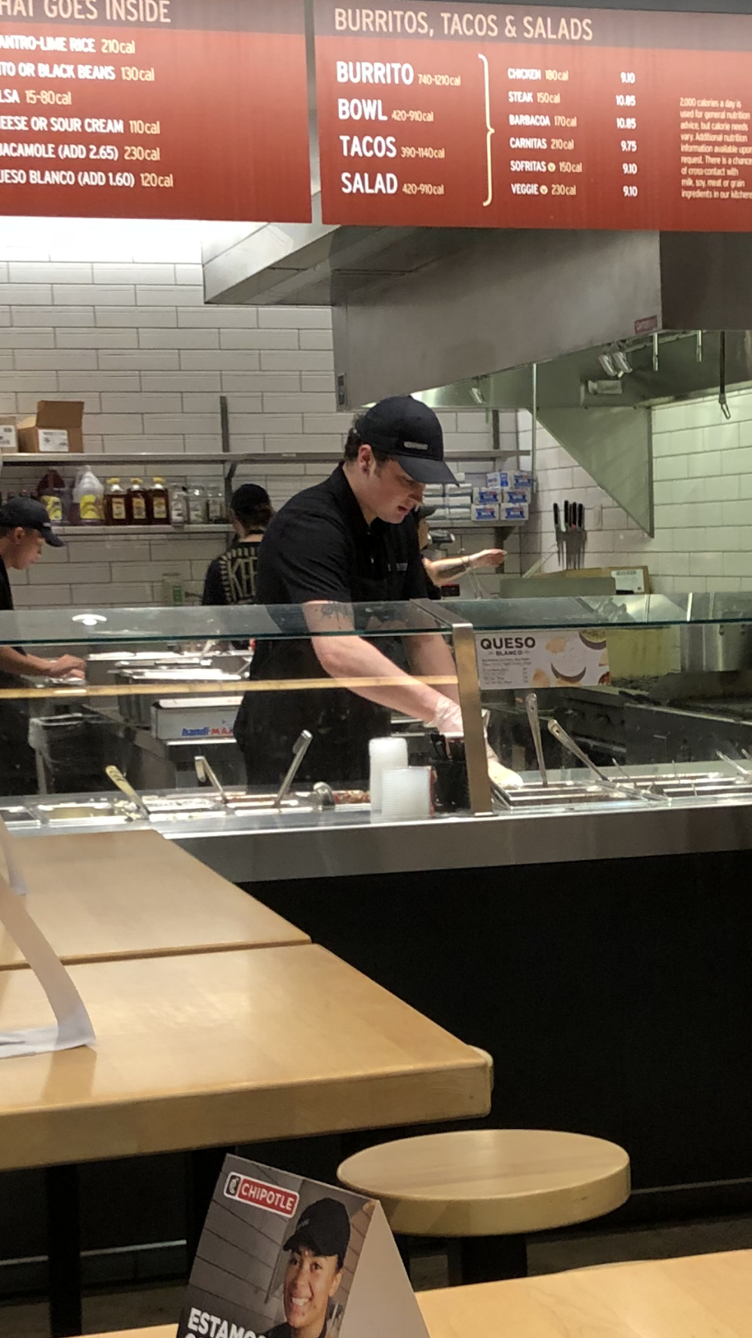 I have a consistently inconsistent experience at this store. Currently 20 people waiting in line watching one new guy make burritos like it’s his first time ever while a lady watches him at the register.