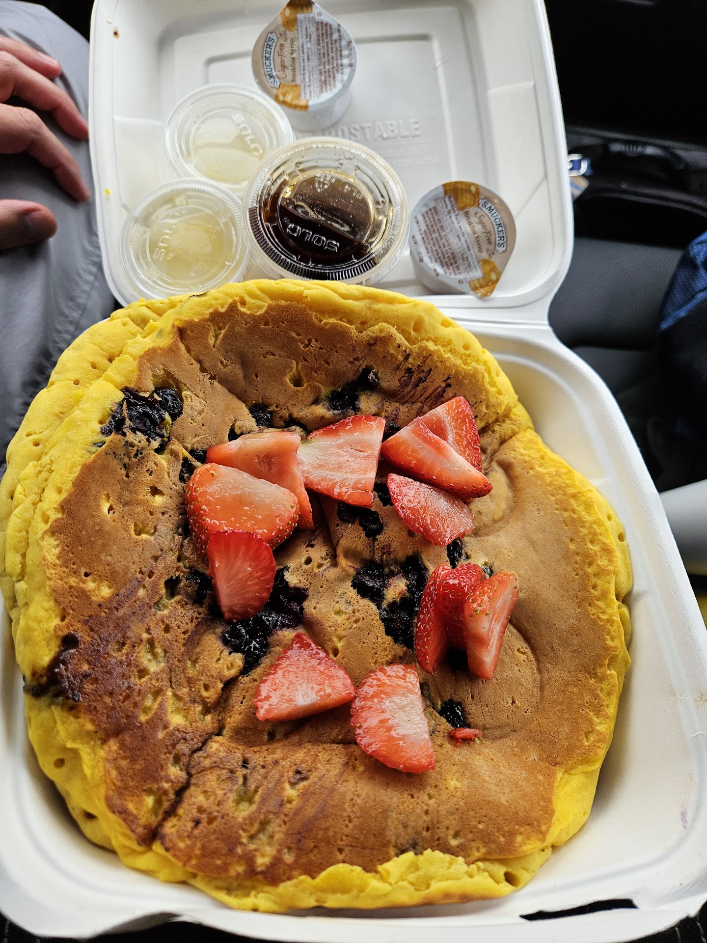 Read moreAt my work in Sacramento, I met the delightful mother of the owner of these restaurants. She was proud to explain the hoodie she was wearing, advertising her daughters love and joy, where she be Crackin eggs like there was crack in the eggs and Stackin pancakes like a pimp be stackin bread! After surveying the photogenic grub plethora on the website, I took it as a sign to stop in on my way to visit fam in Grant's Pass. I had the Elvis; bacon infused fluffy cakes topped with drizzles of melty peanut butter and hunka hunka hunks of banana love stacked atop, so delicious I didn't need syrup. The sausage and eggs on the side were perfection. The pancakes were so huge I had an entire 2nd breakfast the next day. The waiter was so enthusiastic, no doubt he enjoyed his job. The price was more than reasonable. This joint exceeded expectations, I'll likely stop in again on my way back home. Highly...