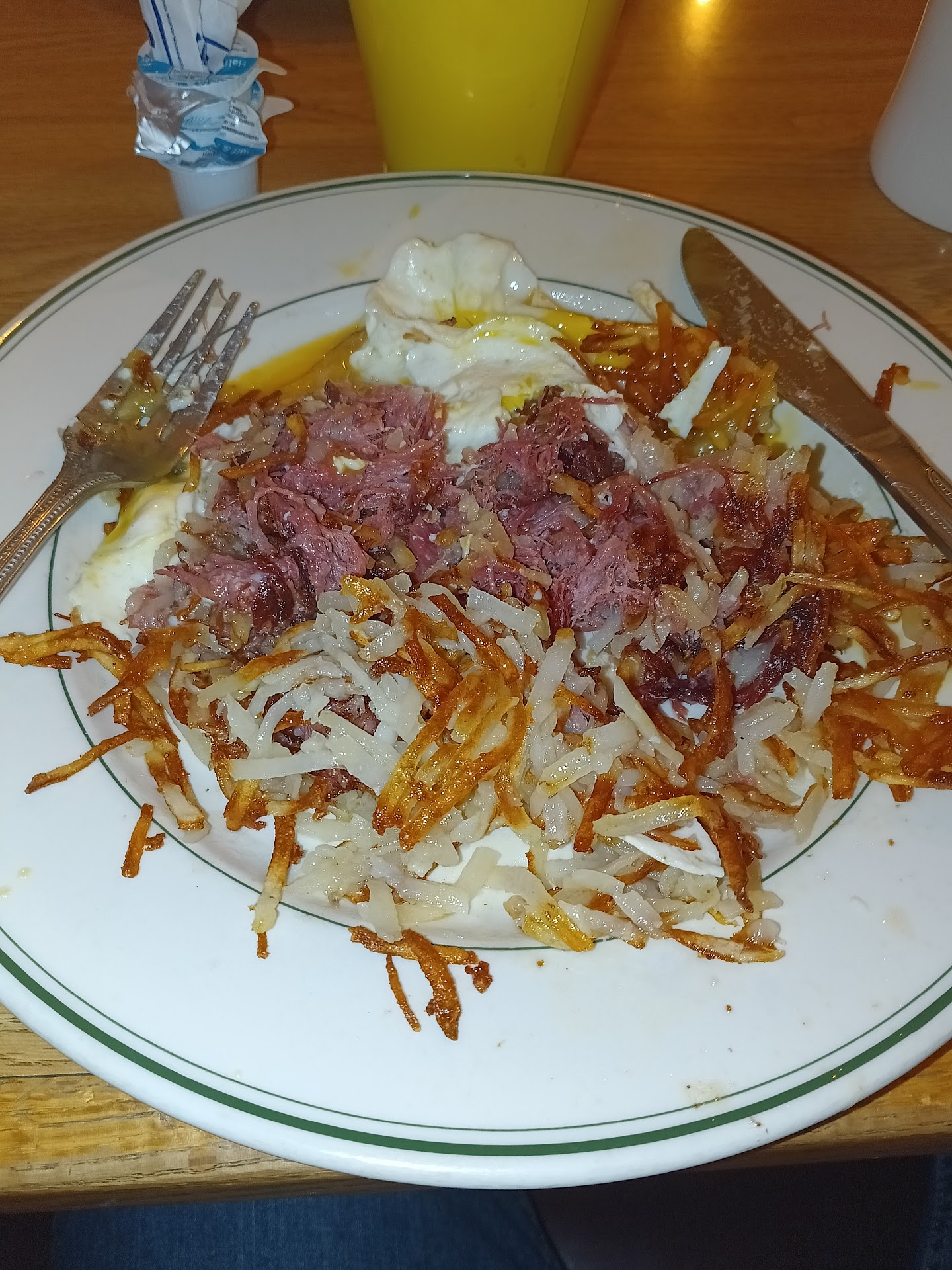 Read moreWe were really disappointed. I ordered their homemade corned beef hash with a couple of eggs. She orders biscuits and gravy. We waited forever initially, to be seated, even though there were three staff clearly busying themselves with other things for some reason. The place takes way too long to provide service. I'm not sure why but they were just acting like they were too busy, when the tables were only about a third full. We were wondering why I was taking so long for our orders to come out. Then it dawned on us. We were served cold dead plates with a couple of fresh eggs on top. Something had happened in between the rest of the plate and the eggs being thrown on right before coming out. I'm talking like a 45-minute turnaround time. The food was cold and chewy. I decided I would pay for it anyway because it wouldn't be too nasty for the dogs, but the waitress did say it would be comped.. Note to staff, your customer is your number...