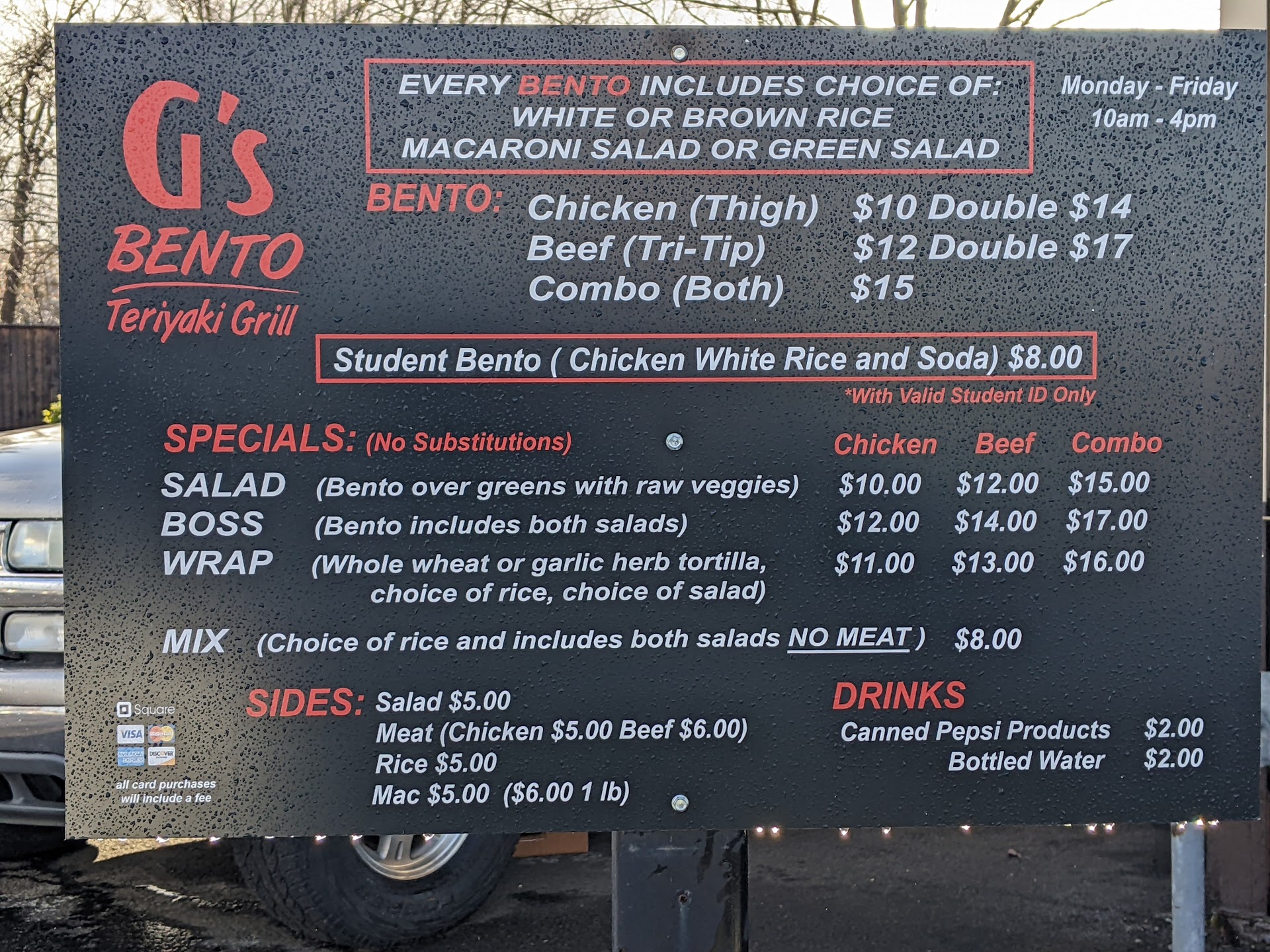 Read moreI had hands down the rudest experience at G's Bento just a few minutes ago. I went through the Drive and ordered, my order came to $10.00 after the girl with long blond wavy hair took my card and started to run it, she tells me that it will be $10.50 ??? Why "Because of the card you are using" i say ok? you just told me $10.00 now it is another 50cents after she takes my card. I say, ok but i think that is wrong and i probably wont be coming back. She says, "then we just wont be serving you!" and slams the window on me, then puts her hand up to me in the window to block me...Are you kidding me? I have never in my life been treated like that as a customer. I said nothing rude or mean, just that i thought it is wrong to tell a customer that it is one price and then charge them another, I will NEVER go to this establishment ever again and I will be telling every one I know about it. There is no excuse for that sort of behavior when running a buisness. Dear Mr.Jared Gail, i have owned several service based business and have never once treated a customer so poorly. Your employee or whom ever she is, should be let go...
