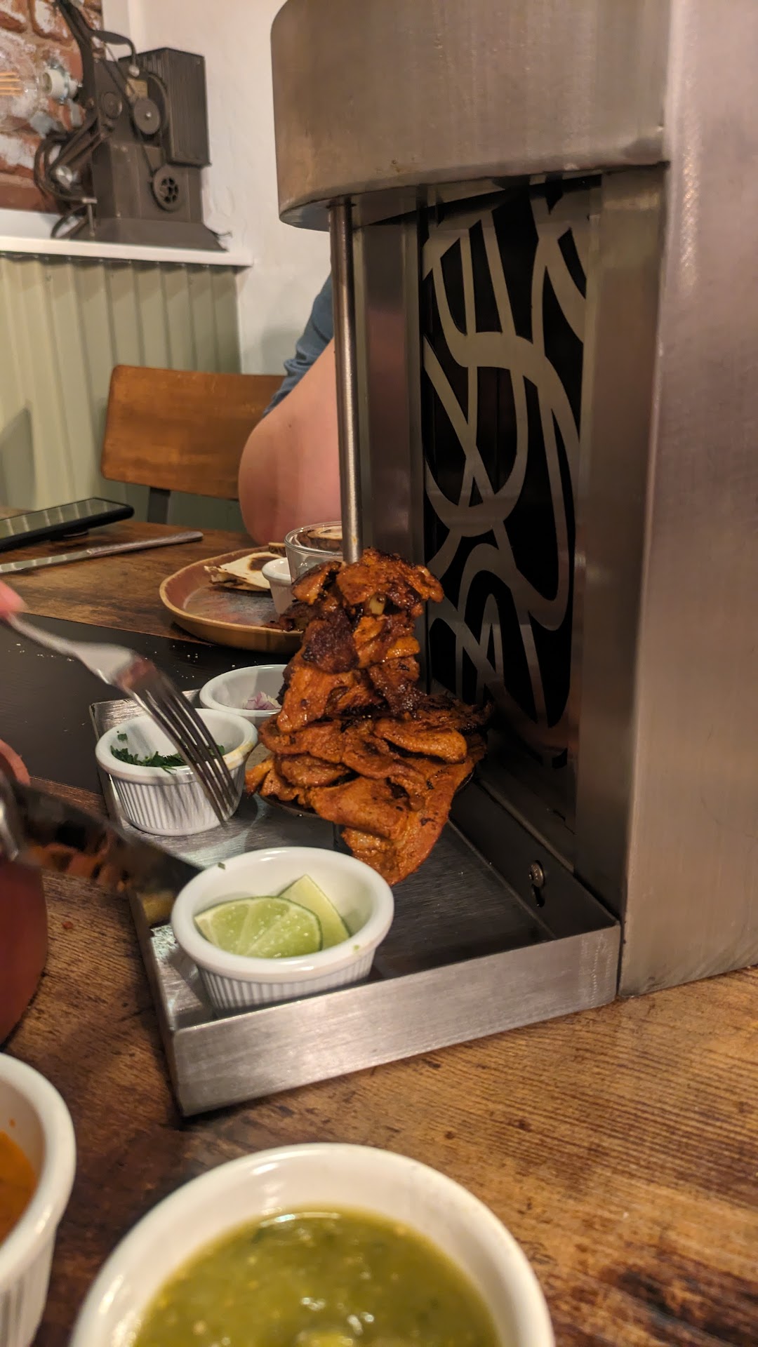 Where to begin... First off host asked us if we were ready to order, said yes, then waiting at least 5 minutes for server to finally show up. Ordered skirt steak ( medium rare)with truffle potatoes, cauliflower. Gringa al pastor, and mini trompo. Food took at least 45 minutes to show up. No sign of anyone after we ordered , to say food was coming or anything. Food shows up, the gringa was burnt. Trompo was barely half the size of the picture from the menu, we even asked if it was enough food for 2 people ($35) skirt steak with truffle potatoes was delivered as a ribeye with crinkle fries. I asked the server about the skirt, and she didn't seem to know that it wasn't a skirt and was ribeye. She did ask if we wanted to return it but with food taking so long I had no hope of getting anything else in a timely manner. Cauliflower didn't come with the rest of our dinner so asked about it. 10 minutes later, the softest overcooked flavorless plate of cauliflower showed up. Was supposed to have a chile mayonnaise and cotija cheese on it. Nothing of the sort. Started eating the steak and it was completely overcooked, dry, and no flavor. When I asked about the truffle potatoes, she said that they told her that they were out, but didn't pass that information on to us. Clearly frustrated, she did offer to comp the steak. We also mentioned that our gringa was burnt and somehow they made a new one in about 2 minutes. No plates were given when our food arrived. Asked the back waiter for plates and showed up with cup saucers. Overall pretty much a disaster, the small amount of trompo pastor meat was tasty, and the red salsa. WILL NOT...