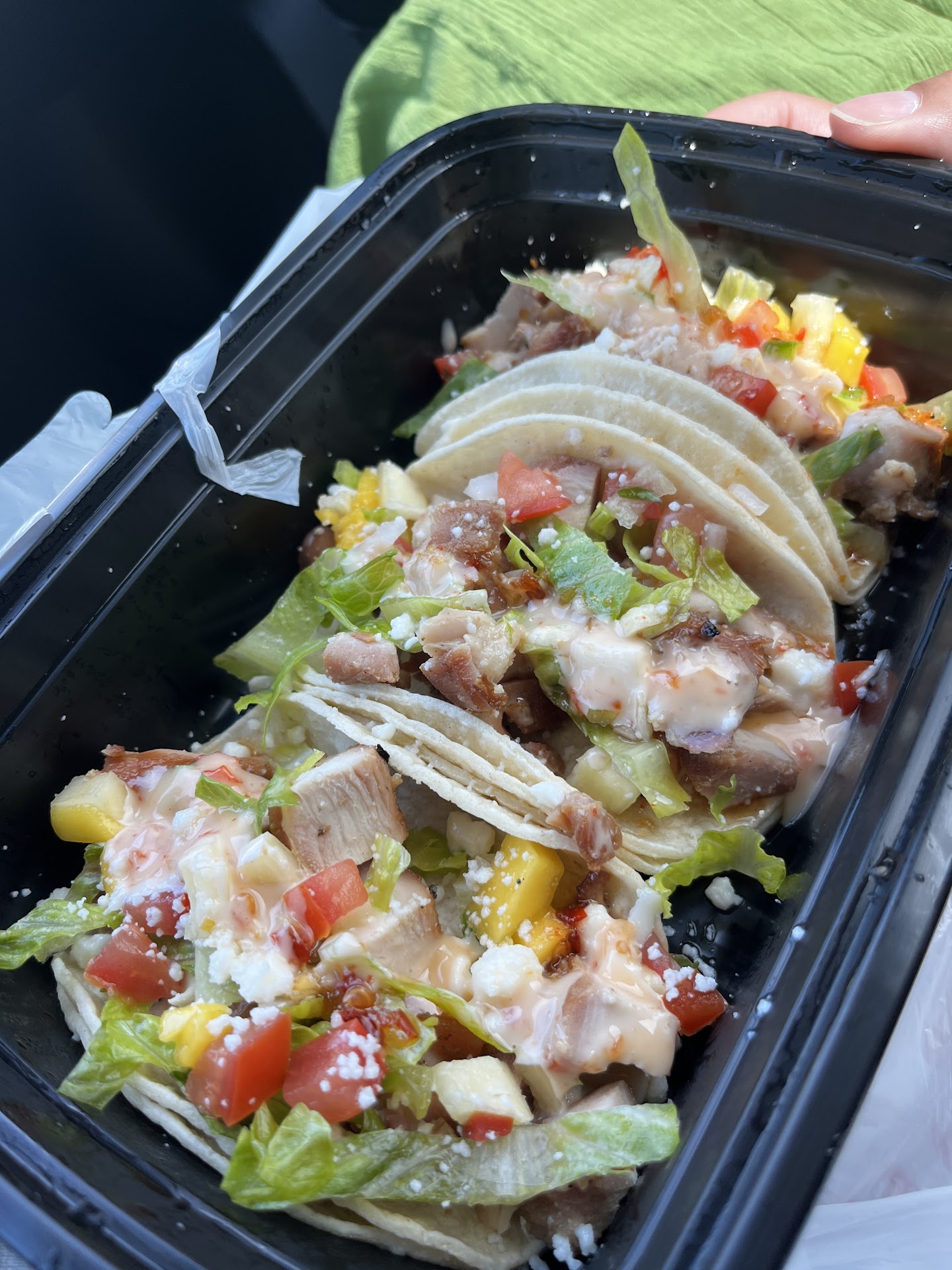 The only reason I gave it four instead of five stars... and this is my only real gripe... other than no white meat chicken offered... is the fact that the chicken is an uncut... undiced slab of meat. Again, it was a clean piece with small amounts of fat and no bone... but as most of us are eating out of our cars right now... having to cut the meat with the plastic knife and fork was troublesome inside the car. I may ask if they can dice up the meat for me. I suppose if I was at home or a picnic table it wouldn't have been much of a big deal. I just have no flat places in the car to set the container down to cut. Balancing act to say the least.