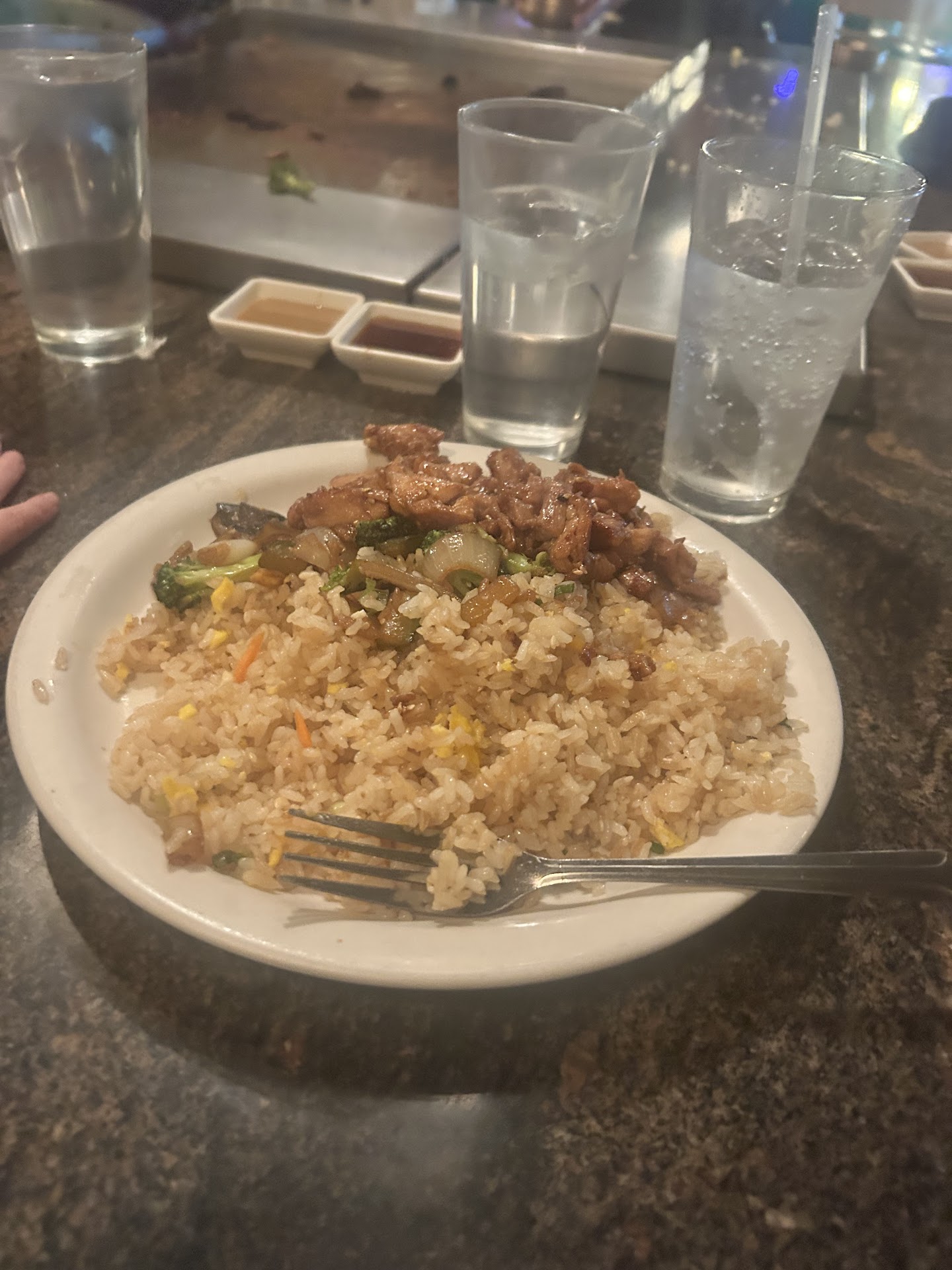 Read moreFirst visit, single party looking for a seat at a table with the grill without reservations..Entrance is a steep ramp with railings no stairs...Staff very polite and accomadating and sat me with a family at the hibachi style table which serves 10-12 people for teppanyaki dinners. Restaurant ambiance is contemporary warehouse style, with modern drop down suspended ceilings, lighting and new light colored flooring.Full bar, sushi menu , choice of hibachi or table seating. Service very good. Meal surprisingly tasteful and plentiful..Ordered chicken and shrimp which was made with lemon garlic and perfectly cooked. Tried one piece of teriyaki chicken and VERY surprised at the excellent sauce!! Well balanced..Each meal comes with miso or salad.. Plentiful and tasty rice, mixed vegetables including onion, zucchini, mushrooms and broccoli, perfectly al dente and well seasoned with your choice of meats , seafood. or veggies ..all grilled to your preference at the table as you enjoy the masterful chefs putting on the knive and fire show.!! **Reservations recommended to insure a table. 10 people (+-)/ table and you may be sharing with another party