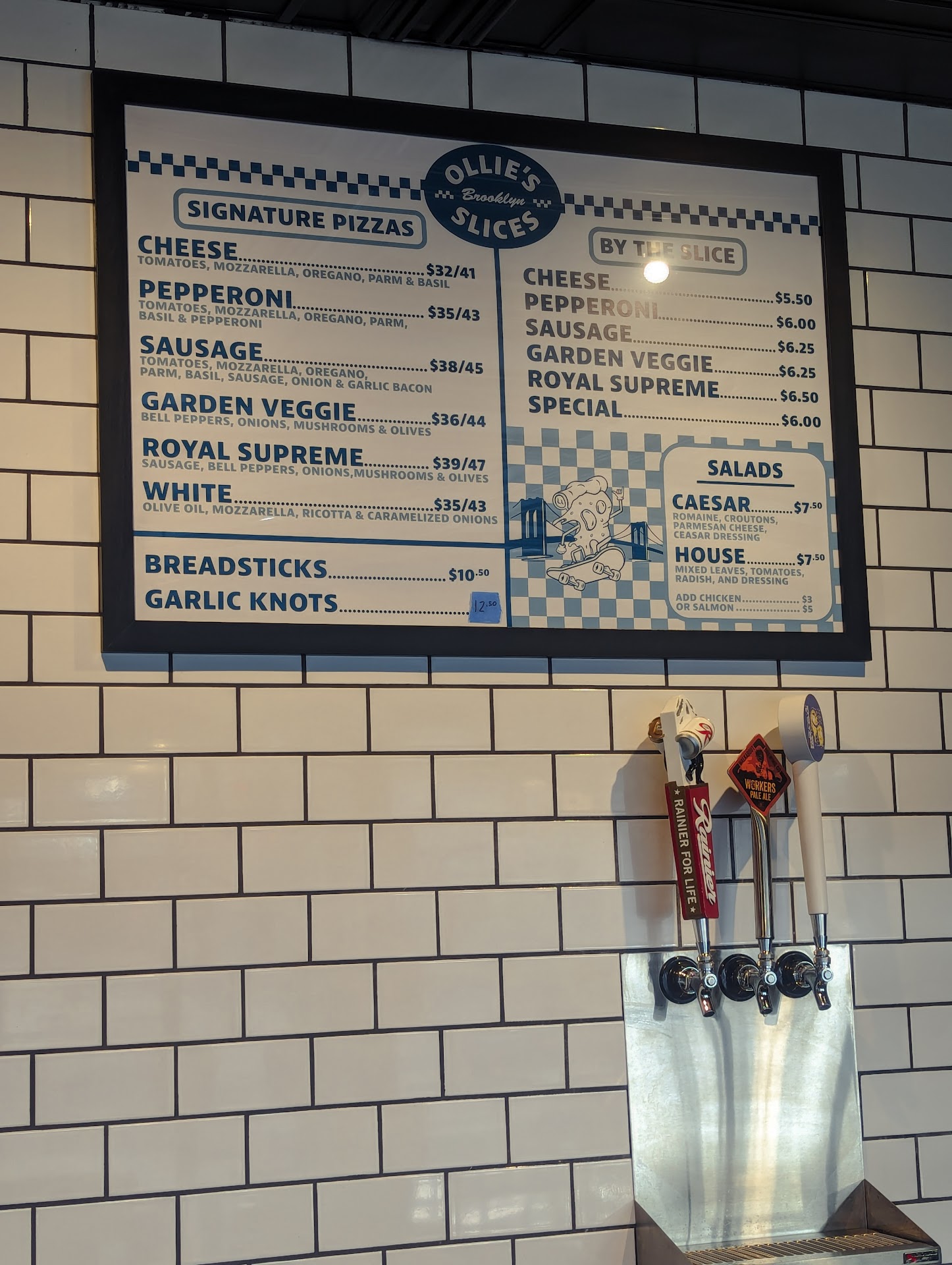 The vibe going in is chill. The menu is simple and not complicated (in such a great way) and they offer specialty pizzas as well as their delicious cheese pizza. I normally like to put a bunch of toppings because anywhere else just s*cks as a normal cheese but Ollie's bakes such a great cheese you don't even need toppings. I also missed getting a pizza by the slice and Ollie's offers that in case you're looking for a light lunch and a small taste of NY.