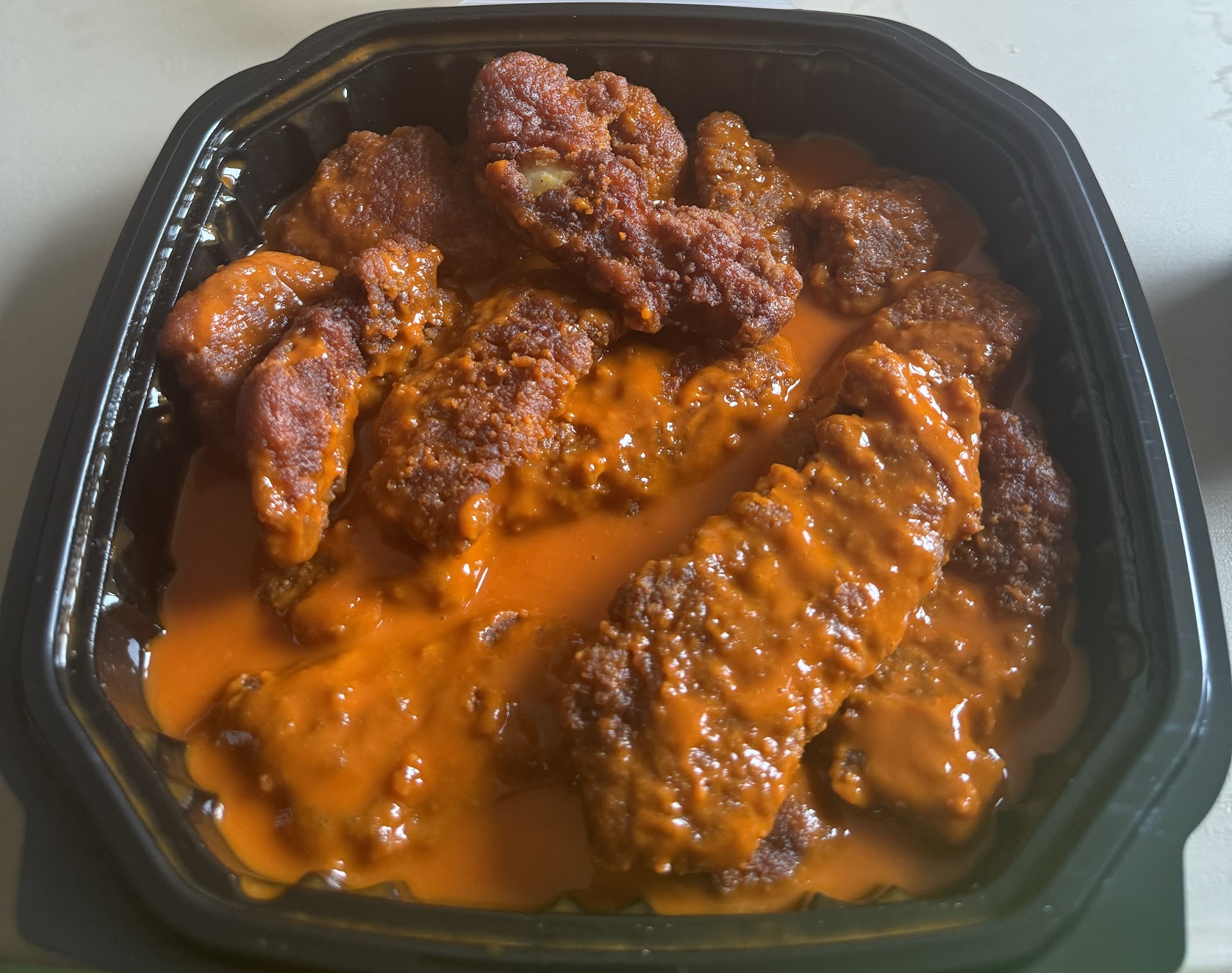 When I got my food The fried mushrooms looked perfect So there was no complaint there, but, When I opened the container of buffalo chicken, I was shocked to find that the chicken looked almost blackened, and it was drowned in buffalo sauce