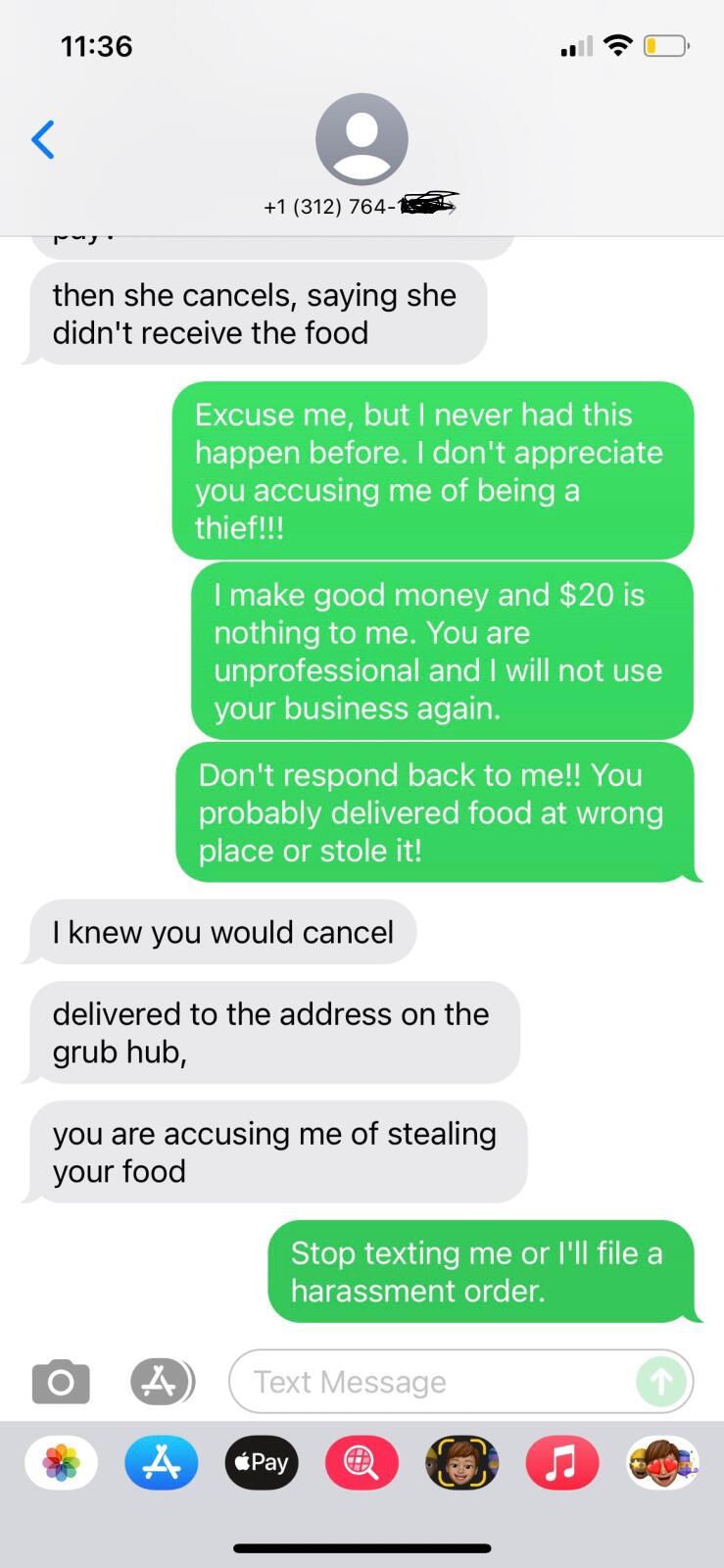 Read moreI made an order on Grubhub for Chicken and waffles and choose the contact-free delivery option. The delivery driver texted me he's here. I responded to leave the food at the front door, as I chose the contact free delivery option. I went outside 2 mins later and said I don't see the food (I checked my back door too), and he re-iterates my address and I am confirmed it but said there's no food on my front porch. (FYI, I live in a safe area and never experienced theft by neighbors, so I know it's not them) He said he left it at my front porch and then accused me of lying about not receiving the food so I don't pay for it. Obviously, I was offended my this and responded (per the texts) below. He then said "I knew you would cancel" even though I said don't respond, he only stopped when I told him I would file a harassment order if he doesn't stop texting me. This is very unprofessional and a bad reflection on the restaurant for their delivery person to accuse me of stealing, really ridiculous since I use GH all the time and never had this issue, and would never steal food that I am capable of paying for, a mere $17 for food. I will never purchase anything from this restaurant and hopes the delivery driver gets fired!